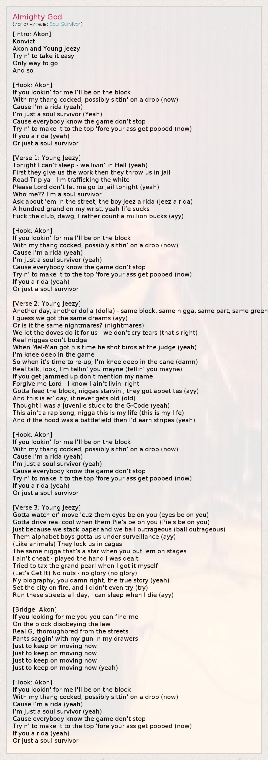 [Вступление - Akon:] Конвикт, 1 Эйкон и Ян Джизи, Стараемся не напрягаться - Только так и надо, Так что... [Припев: Akon] Если ты ищешь меня, я буду на районе С заряженной пушкой, возможно, сидя в своей тачке 2 (сейчас). Ведь я райдер 3 (да), Я просто выживший душой (да), Ведь каждый знает, что игра не закончится В попытке пробиться к вершине, пока твою задницу не подстрелили (сейчас), Если ты райдер (да) Или просто выживший душой. [Куплет 1: Young Jeezy] Этой ночью мне не спится - мы живем в аду (да), Сначала они дают нам работу, а потом сажают в тюрьму. 4 Погнали со мной - я барыжу порошком, Пожалуйста, Боже, не дай мне попасть сегодня в тюрьму (да). Кто я? Я выживший душой, Спроси о них на улице, пацан - чертов райдер (чертов райдер), Сто тысяч баксов у меня на запястье, 5 да, жизнь - отстой, К черту клуб, чел, я лучше сосчитаю миллион баксов (эйй). [Припев: Akon] Если ты ищешь меня, я буду на районе С заряженной пушкой, возможно, сидя в своей тачке (сейчас). Ведь я райдер (да), Я просто выживший душой (да), Ведь каждый знает, что игра не закончится В попытке пробиться к вершине, пока твою задницу не подстрелили (сейчас), Если ты райдер (да) Или просто выживший душой. [Куплет 2: Young Jeezy] Очередной день, очередной доллар (доллар) - тот же квартал, тот же ниггер, та же история, та же зелень. Я думаю, у нас одинаковые мечты (эйй) Или это одинаковые кошмары? (кошмары) Пусть голубки делают это за нас - мы не плачем слезами (это верно). Реальные ниггеры не ломаются, Когда Мел-Мэн 6 нашел время, он стрельнул птичкой 7 в судью (да). Я по колено увяз в игре, Так что во время закупки я по колено в кокаине (черт). В натуре говорю, смотри у меня, пацан (смотри у меня, пацан): Если тебя повяжут, не упоминай мое имя. Прости меня, Господи - я знаю, что не живу правильно, Надо кормить район, ниггеры голодают, у них свой аппетит (эйй). И так каждый день, это никогда не стареет (стареет), Хотя я был мальчишкой, 8 живущим по Джи-кодексу 9 (да). Это не рэп, ниггер, это моя жизнь (это моя жизнь), И если бы улица была полем боя, я бы заслужил погоны (да). [Припев: Akon] Если ты ищешь меня, я буду на районе С заряженной пушкой, возможно, сидя в своей тачке (сейчас). Ведь я райдер (да), Я просто выживший душой (да), Ведь каждый знает, что игра не закончится В попытке пробиться к вершине, пока твою задницу не подстрелили (сейчас), Если ты райдер (да) Или просто выживший душой. [Куплет 3: Young Jeezy] Следи за каждым движением, ведь они пасут тебя (пасут тебя), Езди очень спокойно, когда у тебя на хвосте следаки (на хвосте следаки). Просто потому, что мы рубим бабло и круто играем в мяч (круто играем в мяч), Алфавитные парни 10 устанавливают за нами слежку (эйй). (Как животных) Они запирают нас в клетках, Тот же самый ниггер становится звездой, если поставить его на сцену. Я не жульничаю - я делал, что должен был, Пытался прикарманить большую жемчужину, 11 когда она была у меня. (Перейдем к сути) Без яиц нет славы (нет славы), Моя биография, ты чертовски прав, правдива (да). Поджигаю город, даже не пытаясь 12 (пытаясь), Заправляю улицами целый день, я посплю, когда буду мертв (эйй). [Подпевка: Akon] Если ищешь, ты найдешь меня На районе нарушающим закон - Настоящий Джи, чистокровный с улиц, С приспущенными штанами и пушкой в трусах, 13 Просто чтобы оставаться на плаву, Просто чтобы оставаться на плаву, Просто чтобы оставаться на плаву, Просто чтобы оставаться на плаву (да). [Припев: Akon] Если ты ищешь меня, я б