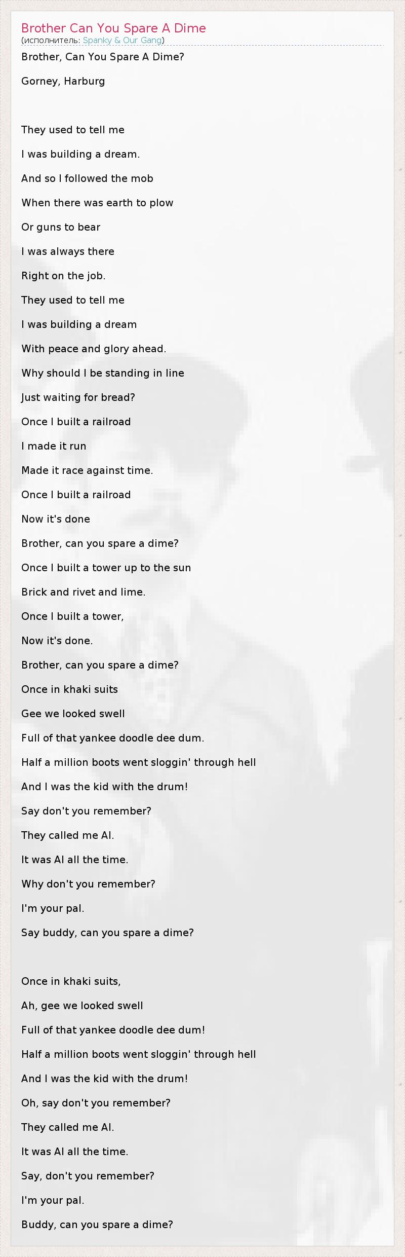Brother, Can You Spare A Dime? Gorney, Harburg They used to tell me I was building a dream. And so I followed the mob When there was earth to plow Or guns to bear I was always there Right on the job. They used to tell me I was building a dream With peace and glory ahead. Why should I be standing in line Just waiting for bread? Once I built a railroad I made it run Made it race against time. Once I built a railroad Now it's done Brother, can you spare a dime? Once I built a tower up to the sun Brick and rivet and lime. Once I built a tower, Now it's done. Brother, can you spare a dime? Once in khaki suits Gee we looked swell Full of that yankee doodle dee dum. Half a million boots went sloggin' through hell And I was the kid with the drum! Say don't you remember? They called me Al. It was Al all the time. Why don't you remember? I'm your pal. Say buddy, can you spare a dime? Once in khaki suits, Ah, gee we looked swell Full of that yankee doodle dee dum! Half a million boots went sloggin' through hell And I was the kid with the drum! Oh, say don't you remember? They called me Al. It was Al all the time. Say, don't you remember? I'm your pal. Buddy, can you spare a dime?