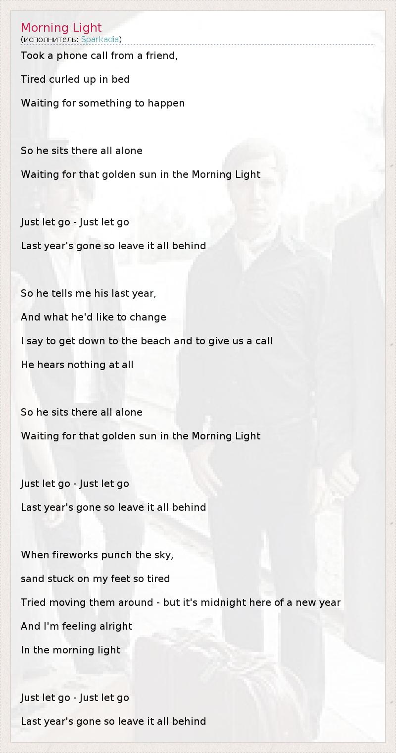 Took a phone call from a friend, Tired curled up in bed Waiting for something to happen So he sits there all alone Waiting for that golden sun in the Morning Light Just let go - Just let go Last year's gone so leave it all behind So he tells me his last year, And what he'd like to change I say to get down to the beach and to give us a call He hears nothing at all So he sits there all alone Waiting for that golden sun in the Morning Light Just let go - Just let go Last year's gone so leave it all behind When fireworks punch the sky, sand stuck on my feet so tired Tried moving them around - but it's midnight here of a new year And I'm feeling alright In the morning light Just let go - Just let go Last year's gone so leave it all behind