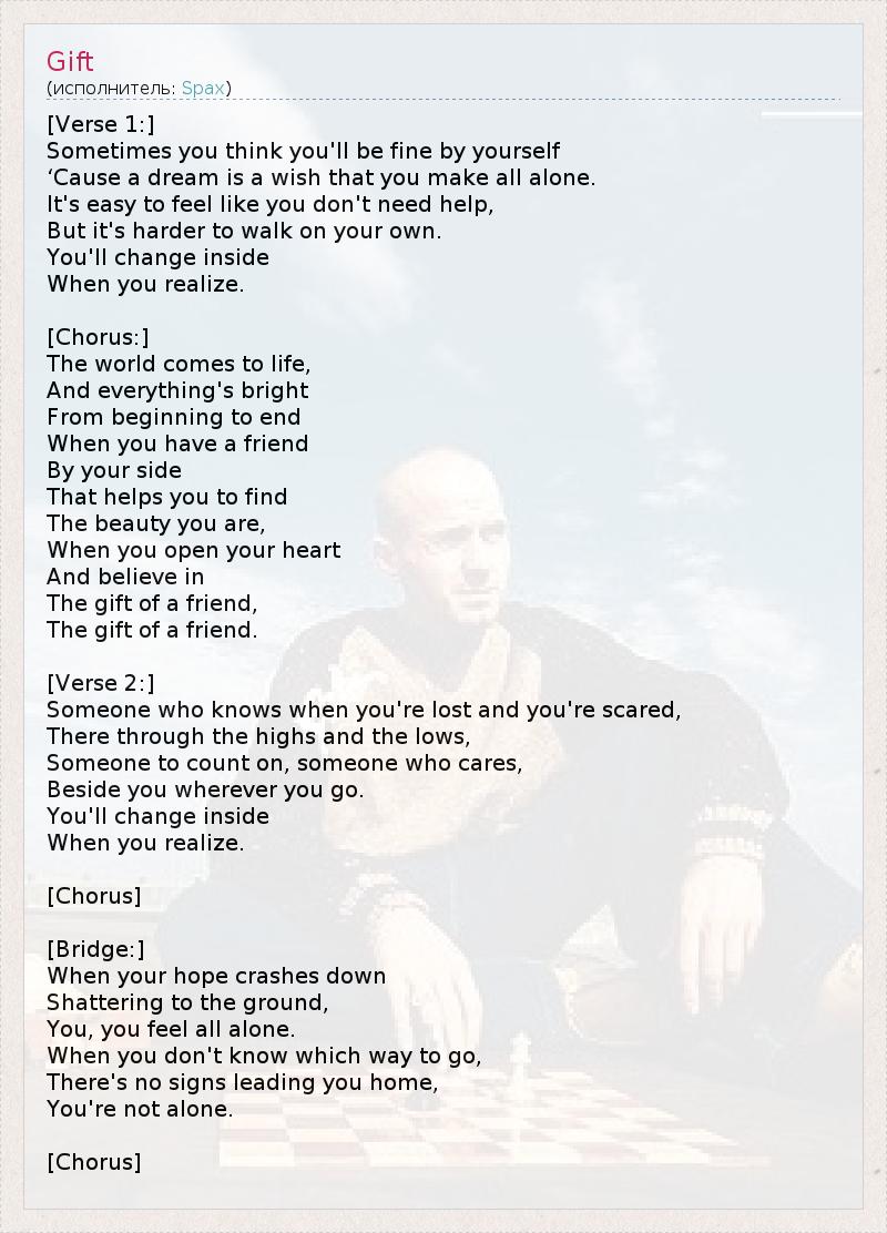 [Куплет 1:] Иногда тебе кажется, что одной будет хорошо, Потому что мечта — это желание, которое оставляет тебя в одиночестве. Легко чувствовать себя так, будто не нуждаешься в помощи, Но делать всё одной гораздо тяжелее. Ты изменишься в душе, Когда поймёшь. [Припев:] Мир оживает, И всё светлеет От начала и до конца, Когда рядом с тобой Есть подруга, Которая поможет отыскать Красоту в тебе, Когда ты распахнёшь своё сердце И поверишь В дар дружбы, В дар дружбы. [Куплет 2:] Та, кто понимает, когда ты запуталась и напугана, Рядом сквозь взлёты и падения, Та, на кого можно рассчитывать, та, кому не всё равно, Кто рядом, куда бы ты ни отправилась. Ты изменишься в душе, Когда поймёшь. [Припев] [Связка:] Когда твои надежды разбиваются, Разлетаясь осколками, Тебе так одиноко. Даже когда ты не знаешь, куда отправиться, И нет знаков, указывающих дорогу домой, Ты не одинока. [Припев]