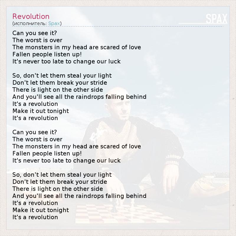 Вы видите? Худшее уже позади. Монстры в моей голове боятся любви. Слушайте, падшие люди! Никогда не поздно изменить нашу судьбу. Поэтому не дайте поглотить ваш свет. Не дайте помешать вам идти вперед. На той стороне есть свет, И вы увидите все капли дождя, падающие у вас за спиной. Это революция. Поймите это сегодня ночью. Это революция. Вы видите? Худшее уже позади. Монстры в моей голове боятся любви. Слушайте, падшие люди! Никогда не поздно изменить нашу судьбу. Поэтому не дайте поглотить ваш свет. Не дайте помешать вам идти вперед. На той стороне есть свет, И вы увидите все капли дождя, падающие у вас за спиной. Это революция. Поймите это сегодня ночью. Это революция.