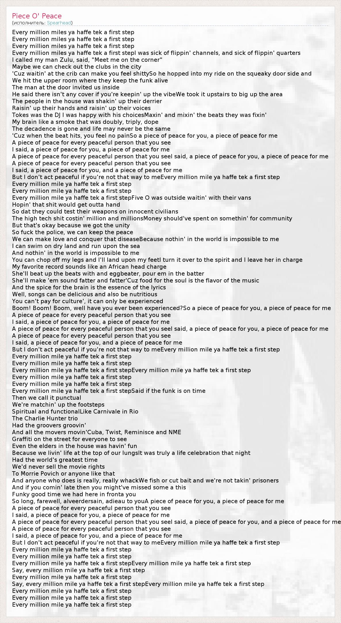Every million miles ya haffe tek a first step Every million miles ya haffe tek a first step Every million miles ya haffe tek a first step Every million miles ya haffe tek a first stepI was sick of flippin' channels, and sick of flippin' quarters I called my man Zulu, said, "Meet me on the corner" Maybe we can check out the clubs in the city 'Cuz waitin' at the crib can make you feel shittySo he hopped into my ride on the squeaky door side and We hit the upper room where they keep the funk alive The man at the door invited us inside He said there isn't any cover if you're keepin' up the vibeWe took it upstairs to big up the area The people in the house was shakin' up their derrier Raisin' up their hands and raisin' up their voices Tokes was the DJ I was happy with his choicesMaxin' and mixin' the beats they was fixin' My brain like a smoke that was doubly, triply, dope The decadence is gone and life may never be the same 'Cuz when the beat hits, you feel no painSo a piece of peace for you, a piece of peace for me A piece of peace for every peaceful person that you see I said, a piece of peace for you, a piece of peace for me A piece of peace for every peaceful person that you seeI said, a piece of peace for you, a piece of peace for me A piece of peace for every peaceful person that you see I said, a piece of peace for you, and a piece of peace for me But I don't act peaceful if you're not that way to meEvery million mile ya haffe tek a first step Every million mile ya haffe tek a first step Every million mile ya haffe tek a first step Every million mile ya haffe tek a first stepFive O was outside waitin' with their vans Hopin' that shit would get outta hand So dat they could test their weapons on innocent civilians The high tech shit costin' million and millionsMoney should've spent on somethin' for community But that's okay because we got the unity So fuck the police, we can keep the peace We can make love and conquer that diseaseBecause nothin' in the world is impossible to me I can swim on dry land and run upon the sea And nothin' in the world is impossible to me You can chop off my legs and I'll land upon my feetI turn it over to the spirit and I leave her in charge My favorite record sounds like an African head charge She'll beat up the beats with and eggbeater, pour em in the batter She'll make 'em sound fatter and fatter'Cuz food for the soul is the flavor of the music And the spice for the brain is the essence of the lyrics Well, songs can be delicious and also be nutritious You can't pay for culture', it can only be experienced Boom! Boom! Boom, well have you ever been experienced?So a piece of peace for you, a piece of peace for me A piece of peace for every peaceful person that you see I said, a piece of peace for you, a piece of peace for me A piece of peace for every peaceful person that you seeI said, a piece of peace for you, a piece of peace for me A piece of peace for every peaceful person that you see I said, a piece of peace for you, and a piece of peace for me But I don't act peaceful if you're not that way to meEvery million mile ya haffe tek a first step Every million mile ya haffe tek a first step Every million mile ya haffe tek a first step Every million mile ya haffe tek a first stepEvery million mile ya haffe tek a first step Every million mile ya haffe tek a first step Every million mile ya haffe tek a first step Every million mile ya haffe tek a first stepSaid if the funk is on time Then we call it punctual We're matchin' up the footsteps Spiritual and functionalLike Carnivale in Rio The Charlie Hunter trio Had the groovers groovin' And all the movers movin'Cuba, Twist, Reminisce and NME Graffiti on the street for everyone to see Even the elders in the house was havin' fun Because we livin' life at the top of our lungsIt was truly a life celebration that night Had the world's greatest time We'd never sell the movie rights To Morrie Povich or anyone like that And anyone who does is really, really whackWe fish or cut bait and we're not takin' prisoners And if you comin' late then you might've missed some a this Funky good time we had here in fronta you So long, farewell, alveerdersain, adieau to youA piece of peace for you, a piece of peace for me A piece of peace for every peaceful person that you see I said, a piece of peace for you, a piece of peace for me A piece of peace for every peaceful person that you seeI said, a piece of peace for you, and a piece of peace for me A piece of peace for every peaceful person that you see I said, a piece of peace for you, and a piece of peace for me But I don't act peaceful if you're not that way to meEvery million mile ya haffe tek a first step Every million mile ya haffe tek a first step Every million mile ya haffe tek a first step Every million mile ya haffe tek a first stepEvery million mile ya haffe tek a first step Say, every million mile ya haffe tek a first step Every million mile ya haffe tek a first step Say, every million mile ya haffe tek a first stepEvery million mile ya haffe tek a first step Every million mile ya haffe tek a first step Every million mile ya haffe tek a first step Every million mile ya haffe tek a first step