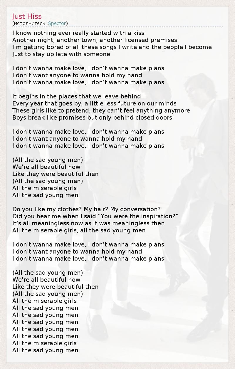 I know nothing ever really started with a kiss Another night, another town, another licensed premises I'm getting bored of all these songs I write and the people I become Just to stay up late with someone I don't wanna make love, I don't wanna make plans I don't want anyone to wanna hold my hand I don't wanna make love, I don't wanna make plans It begins in the places that we leave behind Every year that goes by, a little less future on our minds These girls like to pretend, they can't feel anything anymore Boys break like promises but only behind closed doors I don't wanna make love, I don't wanna make plans I don't want anyone to wanna hold my hand I don't wanna make love, I don't wanna make plans (All the sad young men) We're all beautiful now Like they were beautiful then (All the sad young men) All the miserable girls All the sad young men Do you like my clothes? My hair? My conversation? Did you hear me when I said "You were the inspiration?" It's all meaningless now as it was meaningless then All the miserable girls, all the sad young men I don't wanna make love, I don't wanna make plans I don't want anyone to wanna hold my hand I don't wanna make love, I don't wanna make plans (All the sad young men) We're all beautiful now Like they were beautiful then (All the sad young men) All the miserable girls All the sad young men All the sad young men All the sad young men All the sad young men All the sad young men All the miserable girls All the sad young men