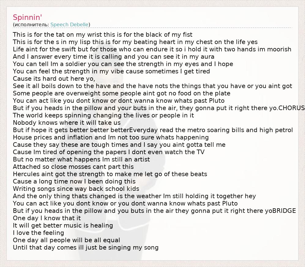 This is for the tat on my wrist this is for the black of my fist This is for the s in my lisp this is for my beating heart in my chest on the life yes Life aint for the swift but for those who can endure it so i hold it with two hands im moorish And I answer every time it is calling and you can see it in my aura You can tell Im a soldier you can see the strength in my eyes and I hope You can feel the strength in my vibe cause sometimes I get tired Cause its hard out here yo, See it all boils down to the have and the have nots the things that you have or you aint got Some people are overweight some people aint got no food on the plate You can act like you dont know or dont wanna know whats past Pluto But if you heads in the pillow and your buts in the air, they gonna put it right there yo.CHORUS The world keeps spinning changing the lives or people in it Nobody knows where it will take us But if hope it gets better better betterEveryday read the metro soaring bills and high petrol House prices and inflation and Im not too sure whats happening Cause they say these are tough times and I say you aint gotta tell me Cause Im tired of opening the papers I dont even watch the TV But no matter what happens Im still an artist Attached so close mosses cant part this Hercules aint got the strength to make me let go of these beats Cause a long time now I been doing this Writing songs since way back school kids And the only thing thats changed is the weather Im still holding it together hey You can act like you dont know or you dont wanna know whats past Pluto But if you heads in the pillow and you buts in the air they gonna put it right there yoBRIDGE One day I know that it It will get better music is healing I love the feeling One day all people will be all equal Until that day comes ill just be singing my song
