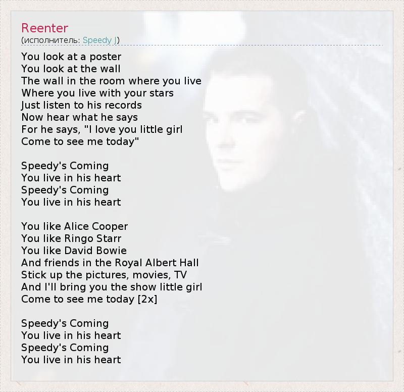 Ты смотришь на плакат, Ты смотришь на стену, Стену в комнате, в которой живёшь, В которой ты живёшь со своими кумирами. Просто слушаешь их записи, Слышишь, что он сейчас сказал? Он говорит: "Я люблю тебя, малышка! Приходи сегодня на меня посмотреть." Спиди приближается, Ты живёшь в его сердце. Спиди уже в пути, Ты живёшь в его сердце. Тебе нравится Элис Купер, Тебе нравится Ринго Старр, Тебе нравится Дэвид Боуи, И парни из Альберт-Холла*. Собираешь фотки, клипы, записи передач. И я приведу тебя на шоу, малышка, Приходи сегодня на меня посмотреть [2 раза] Спиди приближается, Ты живёшь в его сердце. Спиди уже в пути, Ты живёшь в его сердце. * Лондонский королевский Альберт-Холл искусств и наук, концертный зал, место проведения мероприятий и выступлений легендарных групп