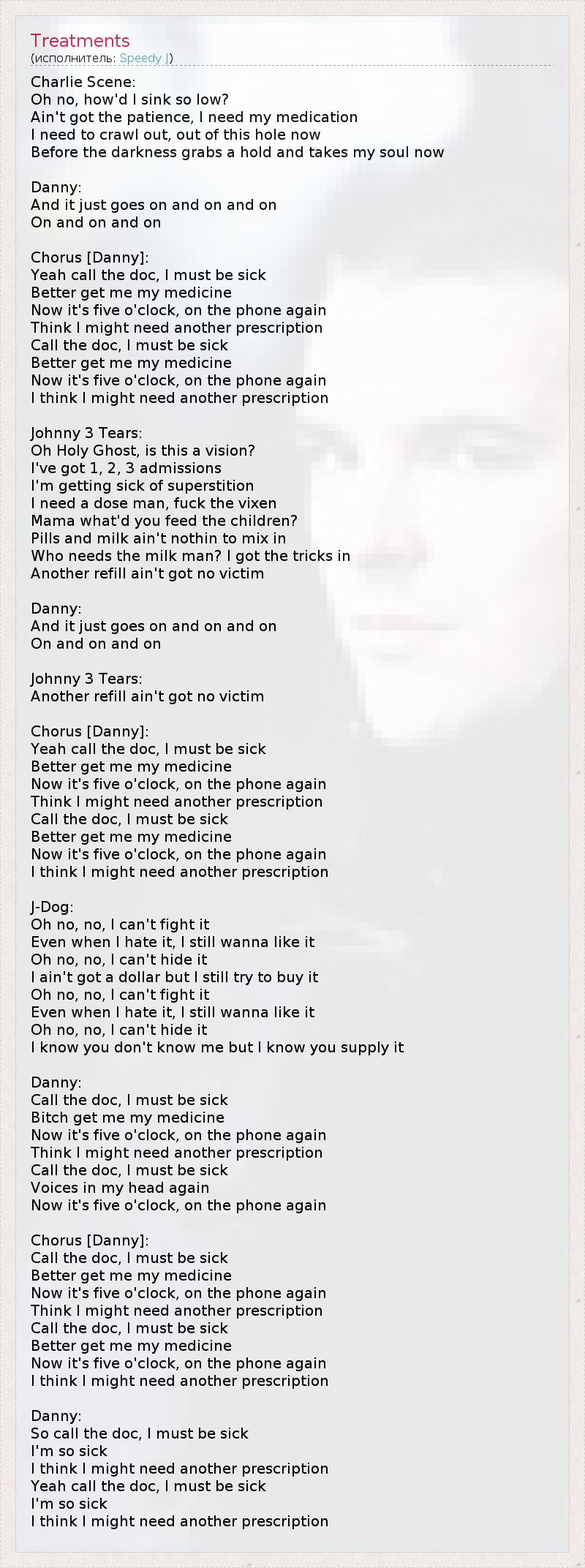[Charlie Scene]: О, нет, когда я успел пасть так низко? Не могу больше терпеть, мне нужно мое лекарство! Я должен выбраться из этой дыры, Пока темнота не забрала мою душу. [Danny]: И это продолжается снова, и снова, и снова... Снова, и снова, и снова... Припев [Danny]: Да, позовите доктора, я, должно быть, болен. Лучше дайте мне мое лекарство. Снова пять утра на экране телефона, Похоже, мне понадобится еще один рецепт. Позовите доктора, я, должно быть, болен. Лучше дайте мне мое лекарство. Снова пять утра на экране телефона, Похоже, мне понадобится еще один рецепт. [Johnny 3 Tears]: О, боже мой, это видение? У меня есть одно, два, три признания. Меня начинает тошнить от суеверий. Мне нужна доза, бл*ть, к черту эту мегеру! Мама, чем ты кормишь детей? Таблетки и молоко нельзя смешивать. Кому вообще нужно молоко? Я стащил их. От еще одной дозы вреда не будет. [Danny]: И это продолжается снова, и снова, и снова... Снова, и снова, и снова... [Johnny 3 Tears]: От еще одной дозы вреда не будет. Припев [Danny]: Да, позовите доктора, я, должно быть, болен. Лучше дайте мне мое лекарство. Снова пять утра на экране телефона, Похоже, мне понадобится еще один рецепт. Позовите доктора, я, должно быть, болен. Лучше дайте мне мое лекарство. Снова пять утра на экране телефона, Похоже, мне понадобится еще один рецепт. [J-Dog]: О, нет, нет, я не могу бороться с этим, Даже когда я ненавижу это, я все еще хочу это любить О, нет, нет, я не могу скрывать это, У меня нет денег, а я все равно пытаюсь их купить О, нет, нет, я не могу бороться с этим, Даже когда я ненавижу это, я все еще хочу это любить О, нет, нет, я не могу скрывать это Я знаю, вы меня не знаете, но я знаю, Вы поставляете их. [Danny]: Позовите доктора, я, должно быть, болен. Дайте мне, бл*ть, мое лекарство! Снова пять утра на экране телефона, Похоже, мне понадобится еще один рецепт. Позовите доктора, я, должно быть, болен. Опять голоса в моей голове, Снова пять утра на экране телефона... Припев [Danny]: Позовите доктора, я, должно быть, болен. Лучше дайте мне мое лекарство. Снова пять утра на экране телефона, Похоже, мне понадобится еще один рецепт. Позовите доктора, я, должно быть, болен. Лучше дайте мне мое лекарство. Снова пять утра на экране телефона, Похоже, мне понадобится еще один рецепт. [Danny]: Так позовите доктора, я, должно быть, болен. Я так устал. Похоже, мне понадобится еще один рецепт. Да, позовите доктора, я, должно быть, болен. Я так устал. Похоже, мне понадобится еще один рецепт.