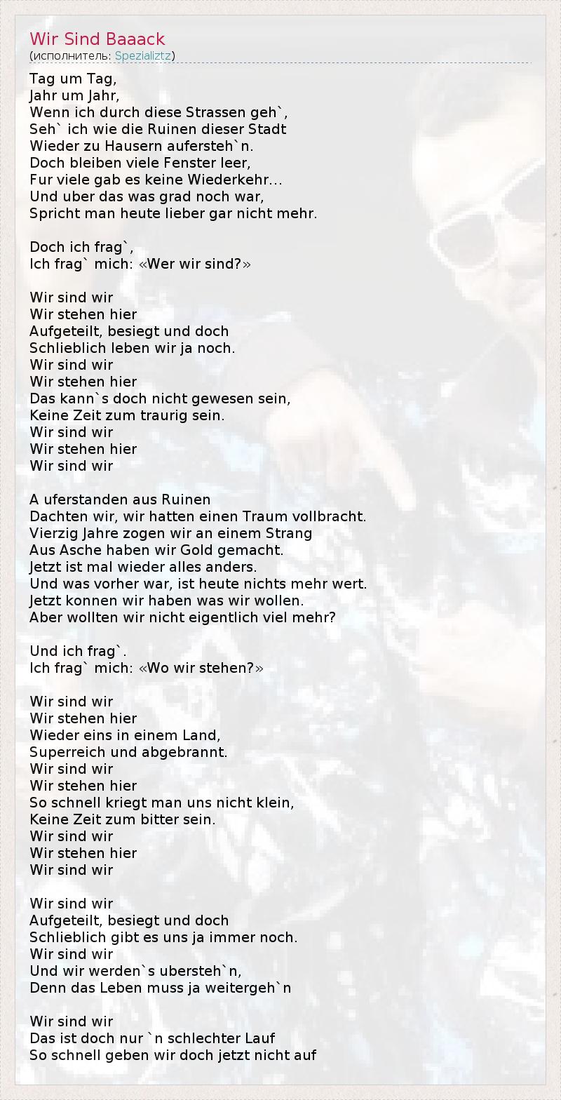 День за днём, Год за годом, Когда я иду по этим улицам, Я вижу, как руины этого города Превращаются обратно в дома. Но многие окна остаются пустыми. Для многих не будет возвращения назад… И о том, что произошло, Сегодня мы так не любим говорить. Но я спрашиваю, Я спрашиваю себя: «Кто мы?» Мы – те, кто мы есть Мы находимся здесь Разделённые, побежденные, но всё-таки Мы по-прежнему живы. Мы – те, кто мы есть Мы находимся здесь Такого больше не случится, Нет времени для печали. Мы – те, кто мы есть Мы находимся здесь Мы – те, кто мы есть Восставшие из руин, Мы обрели кров и принялись воплощать мечту. Сорок лет мы колебались на этой струне, Мы добывали золото из пепла. Сейчас уже всё по-другому, И то, что было раньше, уже не так дорого. Теперь мы можем иметь всё, что хотим, Но нужно ли нам, собственно, ещё больше? И я спрашиваю Я спрашиваю себя: «Где мы?» Мы – те, кто мы есть Мы находимся здесь Мы едины в этой стране Супербогатые, но «перегоревшие» Мы – те, кто мы есть Мы находимся здесь Нелегко быть в подчинении, Но нет времени, чтобы грустить. Мы – те, кто мы есть Мы находимся здесь Мы – те, кто мы есть Мы – те, кто мы есть Разделённые, побеждённые, и всё-таки Мы по-прежнему живы. Мы – те, кто мы есть И будем преодолевать трудности, Потому что жизнь должна продолжаться. Мы – те, кто мы есть Мы переживём неудачи Ничего не даётся легко. [О восстановлении Берлина после Второй мировой войны; и о жизни в Германии, разделённой на ГДР и ФРГ, до момента падения Берлинской стены в 1989 году]