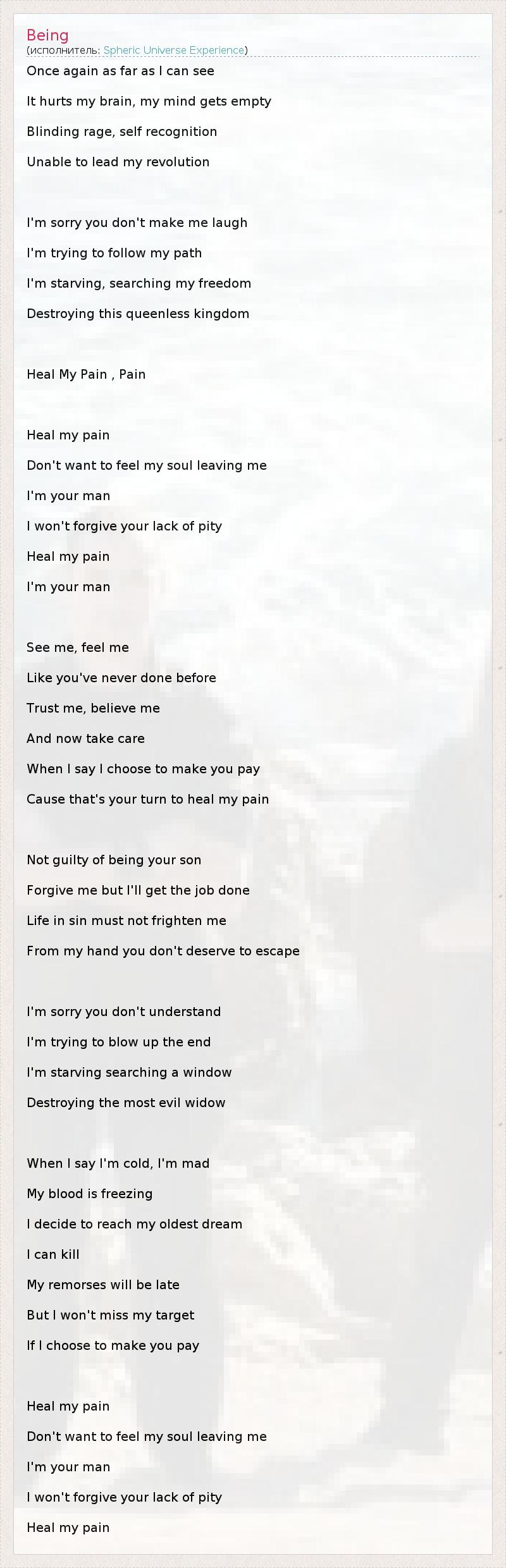 Once again as far as I can see It hurts my brain, my mind gets empty Blinding rage, self recognition Unable to lead my revolution I'm sorry you don't make me laugh I'm trying to follow my path I'm starving, searching my freedom Destroying this queenless kingdom Heal My Pain , Pain Heal my pain Don't want to feel my soul leaving me I'm your man I won't forgive your lack of pity Heal my pain I'm your man See me, feel me Like you've never done before Trust me, believe me And now take care When I say I choose to make you pay Cause that's your turn to heal my pain Not guilty of being your son Forgive me but I'll get the job done Life in sin must not frighten me From my hand you don't deserve to escape I'm sorry you don't understand I'm trying to blow up the end I'm starving searching a window Destroying the most evil widow When I say I'm cold, I'm mad My blood is freezing I decide to reach my oldest dream I can kill My remorses will be late But I won't miss my target If I choose to make you pay Heal my pain Don't want to feel my soul leaving me I'm your man I won't forgive your lack of pity Heal my pain