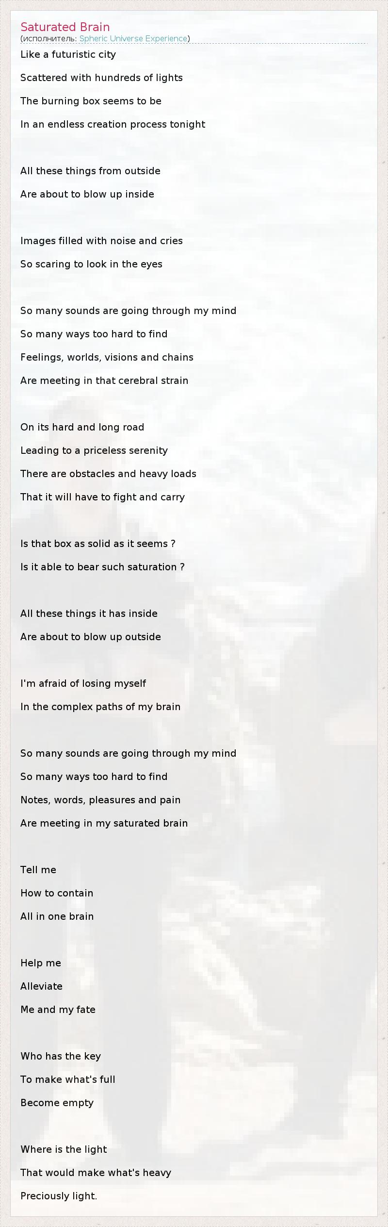 Like a futuristic city Scattered with hundreds of lights The burning box seems to be In an endless creation process tonight All these things from outside Are about to blow up inside Images filled with noise and cries So scaring to look in the eyes So many sounds are going through my mind So many ways too hard to find Feelings, worlds, visions and chains Are meeting in that cerebral strain On its hard and long road Leading to a priceless serenity There are obstacles and heavy loads That it will have to fight and carry Is that box as solid as it seems ? Is it able to bear such saturation ? All these things it has inside Are about to blow up outside I'm afraid of losing myself In the complex paths of my brain So many sounds are going through my mind So many ways too hard to find Notes, words, pleasures and pain Are meeting in my saturated brain Tell me How to contain All in one brain Help me Alleviate Me and my fate Who has the key To make what's full Become empty Where is the light That would make what's heavy Preciously light.
