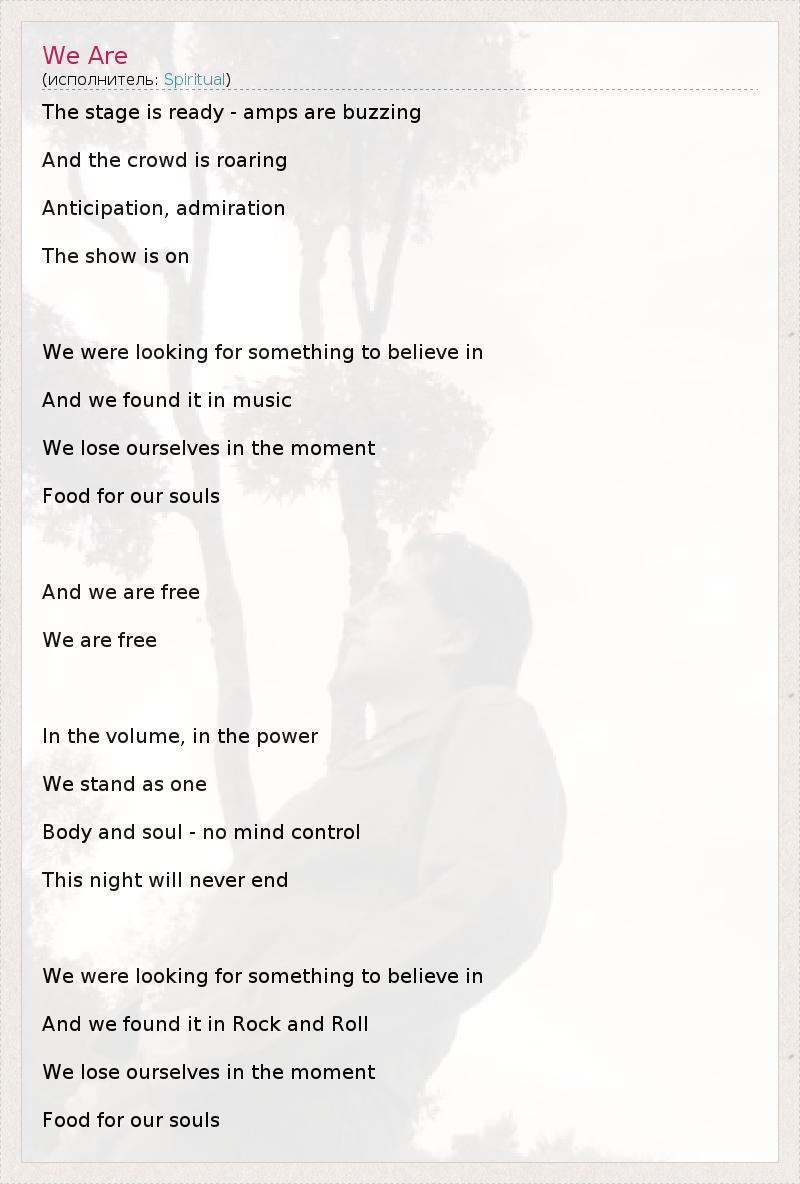 The stage is ready - amps are buzzing And the crowd is roaring Anticipation, admiration The show is on We were looking for something to believe in And we found it in music We lose ourselves in the moment Food for our souls And we are free We are free In the volume, in the power We stand as one Body and soul - no mind control This night will never end We were looking for something to believe in And we found it in Rock and Roll We lose ourselves in the moment Food for our souls