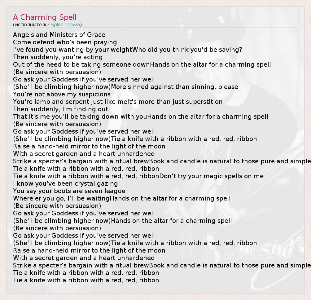 Angels and Ministers of Grace Come defend who's been praying I've found you wanting by your weightWho did you think you'd be saving? Then suddenly, you're acting Out of the need to be taking someone downHands on the altar for a charming spell (Be sincere with persuasion) Go ask your Goddess if you've served her well (She'll be climbing higher now)More sinned against than sinning, please You're not above my suspicions You're lamb and serpent just like meIt's more than just superstition Then suddenly, I'm finding out That it's me you'll be taking down with youHands on the altar for a charming spell (Be sincere with persuasion) Go ask your Goddess if you've served her well (She'll be climbing higher now)Tie a knife with a ribbon with a red, red, ribbon Raise a hand-held mirror to the light of the moon With a secret garden and a heart unhardened Strike a specter's bargain with a ritual brewBook and candle is natural to those pure and simple Tie a knife with a ribbon with a red, red, ribbon Tie a knife with a ribbon with a red, red, ribbonDon't try your magic spells on me I know you've been crystal gazing You say your boots are seven league Where'er you go, I'll be waitingHands on the altar for a charming spell (Be sincere with persuasion) Go ask your Goddess if you've served her well (She'll be climbing higher now)Hands on the altar for a charming spell (Be sincere with persuasion) Go ask your Goddess if you've served her well (She'll be climbing higher now)Tie a knife with a ribbon with a red, red, ribbon Raise a hand-held mirror to the light of the moon With a secret garden and a heart unhardened Strike a specter's bargain with a ritual brewBook and candle is natural to those pure and simple Tie a knife with a ribbon with a red, red, ribbon Tie a knife with a ribbon with a red, red, ribbon