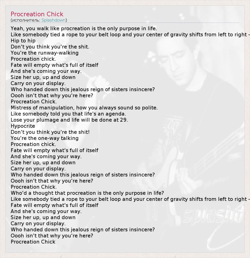 Yeah, you walk like procreation is the only purpose in life. Like somebody tied a rope to your belt loop and your center of gravity shifts from left to right - Hip to hip Don't you think you're the shit. You're the runway-walking Procreation chick. Fate will empty what's full of itself And she's coming your way. Size her up, up and down Carry on your display. Who handed down this jealous reign of sisters insincere? Oooh isn't that why you're here? Procreation Chick. Mistress of manipulation, how you always sound so polite. Like somebody told you that life's an agenda. Lose your plumage and life will be done at 29. Hypocrite Don't you think you're the shit! You're the one-way talking Procreation chick. Fate will empty what's full of itself And she's coming your way. Size her up, up and down Carry on your display. Who handed down this jealous reign of sisters insincere? Oooh isn't that why you're here? Procreation Chick. Who'd a thought that procreation is the only purpose in life? Like somebody tied a rope to your belt loop and your center of gravity shifts from left to right - Fate will empty what's full of itself And she's coming your way. Size her up, up and down Carry on your display. Who handed down this jealous reign of sisters insincere? Oooh isn't that why you're here? Procreation Chick