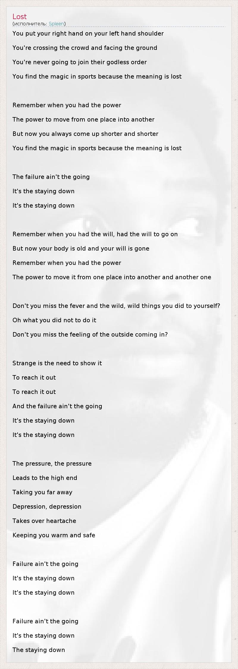 You put your right hand on your left hand shoulder You're crossing the crowd and facing the ground You're never going to join their godless order You find the magic in sports because the meaning is lost Remember when you had the power The power to move from one place into another But now you always come up shorter and shorter You find the magic in sports because the meaning is lost The failure ain't the going It's the staying down It's the staying down Remember when you had the will, had the will to go on But now your body is old and your will is gone Remember when you had the power The power to move it from one place into another and another one Don't you miss the fever and the wild, wild things you did to yourself? Oh what you did not to do it Don't you miss the feeling of the outside coming in? Strange is the need to show it To reach it out To reach it out And the failure ain't the going It's the staying down It's the staying down The pressure, the pressure Leads to the high end Taking you far away Depression, depression Takes over heartache Keeping you warm and safe Failure ain't the going It's the staying down It's the staying down Failure ain't the going It's the staying down The staying down