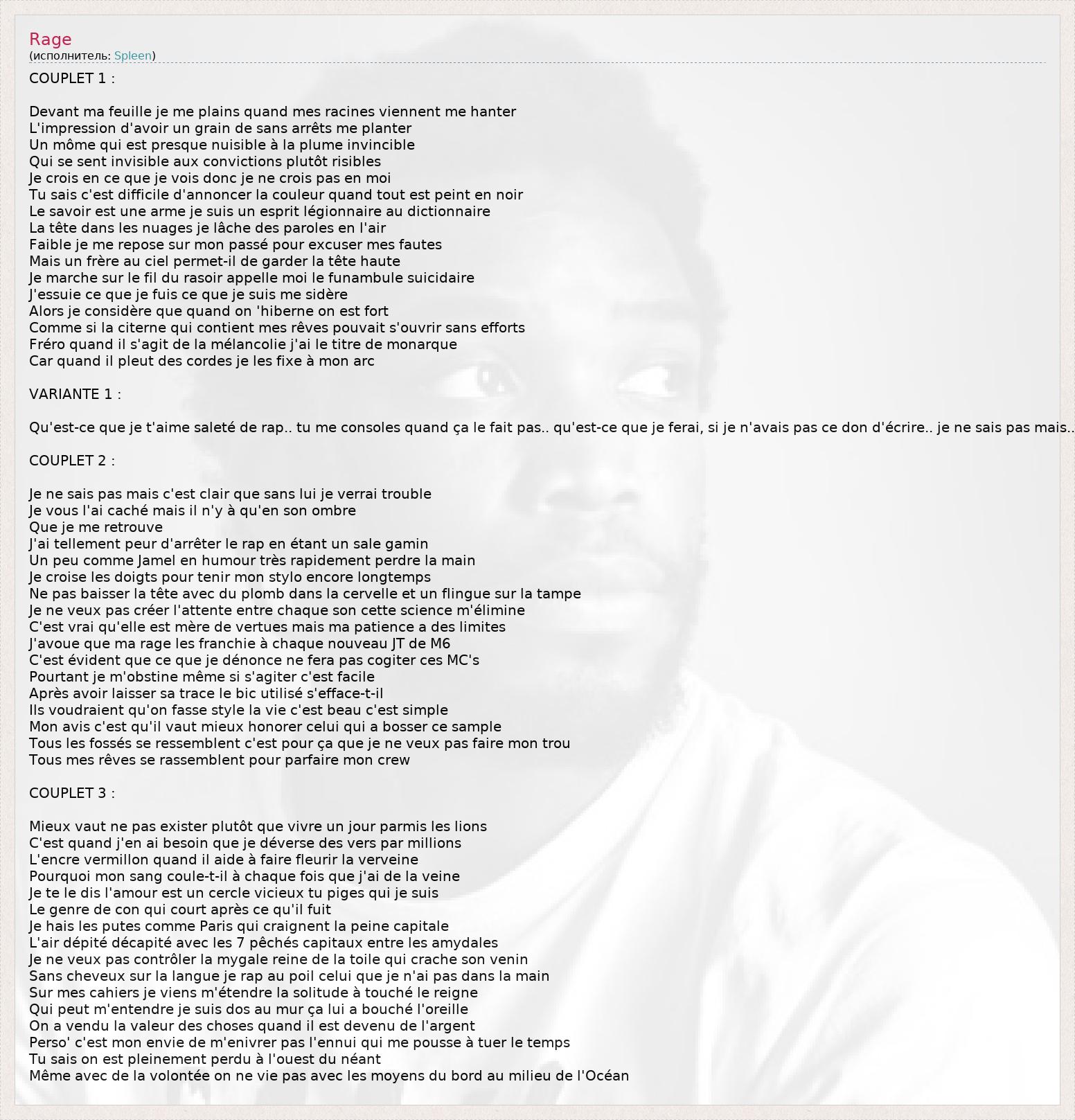 COUPLET 1 : Devant ma feuille je me plains quand mes racines viennent me hanter L'impression d'avoir un grain de sans arrêts me planter Un môme qui est presque nuisible à la plume invincible Qui se sent invisible aux convictions plutôt risibles Je crois en ce que je vois donc je ne crois pas en moi Tu sais c'est difficile d'annoncer la couleur quand tout est peint en noir Le savoir est une arme je suis un esprit légionnaire au dictionnaire La tête dans les nuages je lâche des paroles en l'air Faible je me repose sur mon passé pour excuser mes fautes Mais un frère au ciel permet-il de garder la tête haute Je marche sur le fil du rasoir appelle moi le funambule suicidaire J'essuie ce que je fuis ce que je suis me sidère Alors je considère que quand on 'hiberne on est fort Comme si la citerne qui contient mes rêves pouvait s'ouvrir sans efforts Fréro quand il s'agit de la mélancolie j'ai le titre de monarque Car quand il pleut des cordes je les fixe à mon arc VARIANTE 1 : Qu'est-ce que je t'aime saleté de rap.. tu me consoles quand ça le fait pas.. qu'est-ce que je ferai, si je n'avais pas ce don d'écrire.. je ne sais pas mais.. COUPLET 2 : Je ne sais pas mais c'est clair que sans lui je verrai trouble Je vous l'ai caché mais il n'y à qu'en son ombre Que je me retrouve J'ai tellement peur d'arrêter le rap en étant un sale gamin Un peu comme Jamel en humour très rapidement perdre la main Je croise les doigts pour tenir mon stylo encore longtemps Ne pas baisser la tête avec du plomb dans la cervelle et un flingue sur la tampe Je ne veux pas créer l'attente entre chaque son cette science m'élimine C'est vrai qu'elle est mère de vertues mais ma patience a des limites J'avoue que ma rage les franchie à chaque nouveau JT de M6 C'est évident que ce que je dénonce ne fera pas cogiter ces MC's Pourtant je m'obstine même si s'agiter c'est facile Après avoir laisser sa trace le bic utilisé s'efface-t-il Ils voudraient qu'on fasse style la vie c'est beau c'est simple Mon avis c'est qu'il vaut mieux honorer celui qui a bosser ce sample Tous les fossés se ressemblent c'est pour ça que je ne veux pas faire mon trou Tous mes rêves se rassemblent pour parfaire mon crew COUPLET 3 : Mieux vaut ne pas exister plutôt que vivre un jour parmis les lions C'est quand j'en ai besoin que je déverse des vers par millions L'encre vermillon quand il aide à faire fleurir la verveine Pourquoi mon sang coule-t-il à chaque fois que j'ai de la veine Je te le dis l'amour est un cercle vicieux tu piges qui je suis Le genre de con qui court après ce qu'il fuit Je hais les putes comme Paris qui craignent la peine capitale L'air dépité décapité avec les 7 pêchés capitaux entre les amydales Je ne veux pas contrôler la mygale reine de la toile qui crache son venin Sans cheveux sur la langue je rap au poil celui que je n'ai pas dans la main Sur mes cahiers je viens m'étendre la solitude à touché le reigne Qui peut m'entendre je suis dos au mur ça lui a bouché l'oreille On a vendu la valeur des choses quand il est devenu de l'argent Perso' c'est mon envie de m'enivrer pas l'ennui qui me pousse à tuer le temps Tu sais on est pleinement perdu à l'ouest du néant Même avec de la volontée on ne vie pas avec les moyens du bord au milieu de l'Océan
