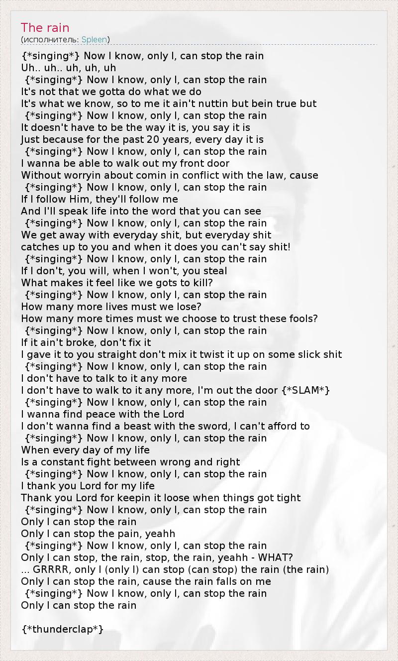 Теперь я знаю, только я могу остановить дождь Uh.. uh.. uh, uh, uh Это не то что мы должны делать, но мы это делаем. То, что мы знаем, для меня ничего не значит, но это истина. Теперь я знаю, только я могу остановить дождь Но это не тот путь который нам нужен Но это так уже 20 лет, изо дня в день Теперь я знаю, только я могу остановить дождь Я не могу выйти в парадную дверь, без волнений Чтобы не преступить закон, потому что… Теперь я знаю, только я могу остановить дождь Если я пойду за ними и они пойдут за мной. Теперь я буду говорить с жизнью своими словами, Которые понимаешь только ты. Теперь я знаю, только я могу остановить дождь Мы выберемся из повседневного г…, но оно Опять подхватывает тебя и ты говоришь «Вот черт!» Теперь я знаю, только я могу остановить дождь Если не смогу, ты сможешь, Если не захочу, ты захочешь Что мы чувствуем когда убиваем? Теперь я знаю, только я могу остановить дождь Мне не придется больше говорить Мне не придется больше гулять Меня нет. Теперь я знаю, только я могу остановить дождь Я хочу помириться с Лордом Я не хочу будить спящую собаку Я не могу себе этого позволить. Теперь я знаю, только я могу остановить дождь Когда каждый день в моей жизни Идет борьба, что правильно, а что нет. Теперь я знаю, только я могу остановить дождь Я благодарен Лорду за мою жизнь Благодарю Вас Лорд за то, что сбросил тяжесть бед. Теперь я знаю, только я могу остановить дождь Только я могу остановить дождь Только я могу остановить боль, yeahhh. Теперь я знаю, только я могу остановить дождь Только я могу остановить дождь, стоп, дождь-Что? GRRR, только я (только я) могу остановить(могу остановит)дождь(дождь) Только я могу остановить дождь, пусть прольется Осенний дождь на меня. Только я могу остановить дождь, стоп, дождь-Что? Теперь только я могу остановить дождь Только могу остановить дождь.