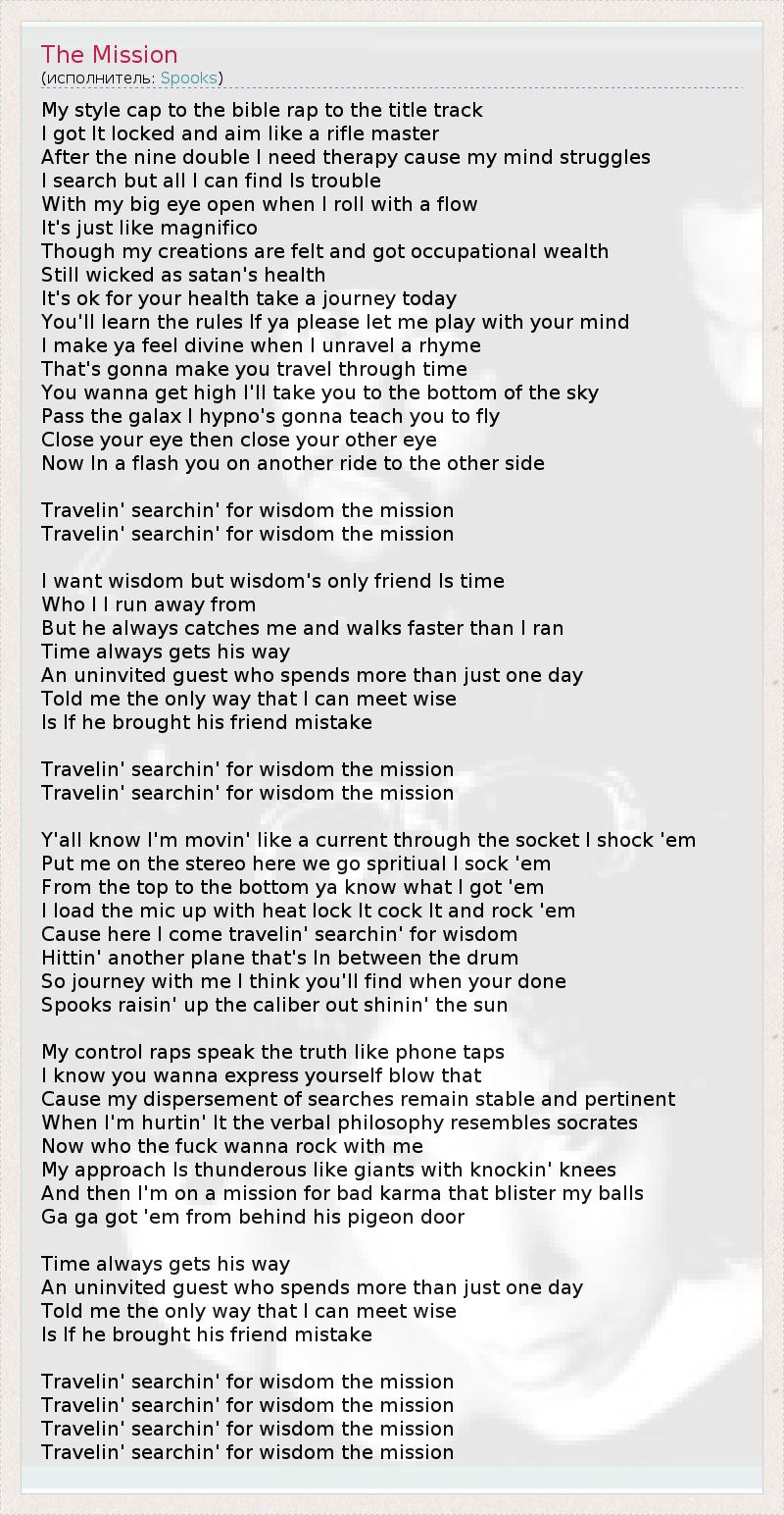 My style cap to the bible rap to the title track I got It locked and aim like a rifle master After the nine double I need therapy cause my mind struggles I search but all I can find Is trouble With my big eye open when I roll with a flow It's just like magnifico Though my creations are felt and got occupational wealth Still wicked as satan's health It's ok for your health take a journey today You'll learn the rules If ya please let me play with your mind I make ya feel divine when I unravel a rhyme That's gonna make you travel through time You wanna get high I'll take you to the bottom of the sky Pass the galax I hypno's gonna teach you to fly Close your eye then close your other eye Now In a flash you on another ride to the other side Travelin' searchin' for wisdom the mission Travelin' searchin' for wisdom the mission I want wisdom but wisdom's only friend Is time Who I I run away from But he always catches me and walks faster than I ran Time always gets his way An uninvited guest who spends more than just one day Told me the only way that I can meet wise Is If he brought his friend mistake Travelin' searchin' for wisdom the mission Travelin' searchin' for wisdom the mission Y'all know I'm movin' like a current through the socket I shock 'em Put me on the stereo here we go spritiual I sock 'em From the top to the bottom ya know what I got 'em I load the mic up with heat lock It cock It and rock 'em Cause here I come travelin' searchin' for wisdom Hittin' another plane that's In between the drum So journey with me I think you'll find when your done Spooks raisin' up the caliber out shinin' the sun My control raps speak the truth like phone taps I know you wanna express yourself blow that Cause my dispersement of searches remain stable and pertinent When I'm hurtin' It the verbal philosophy resembles socrates Now who the fuck wanna rock with me My approach Is thunderous like giants with knockin' knees And then I'm on a mission for bad karma that blister my balls Ga ga got 'em from behind his pigeon door Time always gets his way An uninvited guest who spends more than just one day Told me the only way that I can meet wise Is If he brought his friend mistake Travelin' searchin' for wisdom the mission Travelin' searchin' for wisdom the mission Travelin' searchin' for wisdom the mission Travelin' searchin' for wisdom the mission