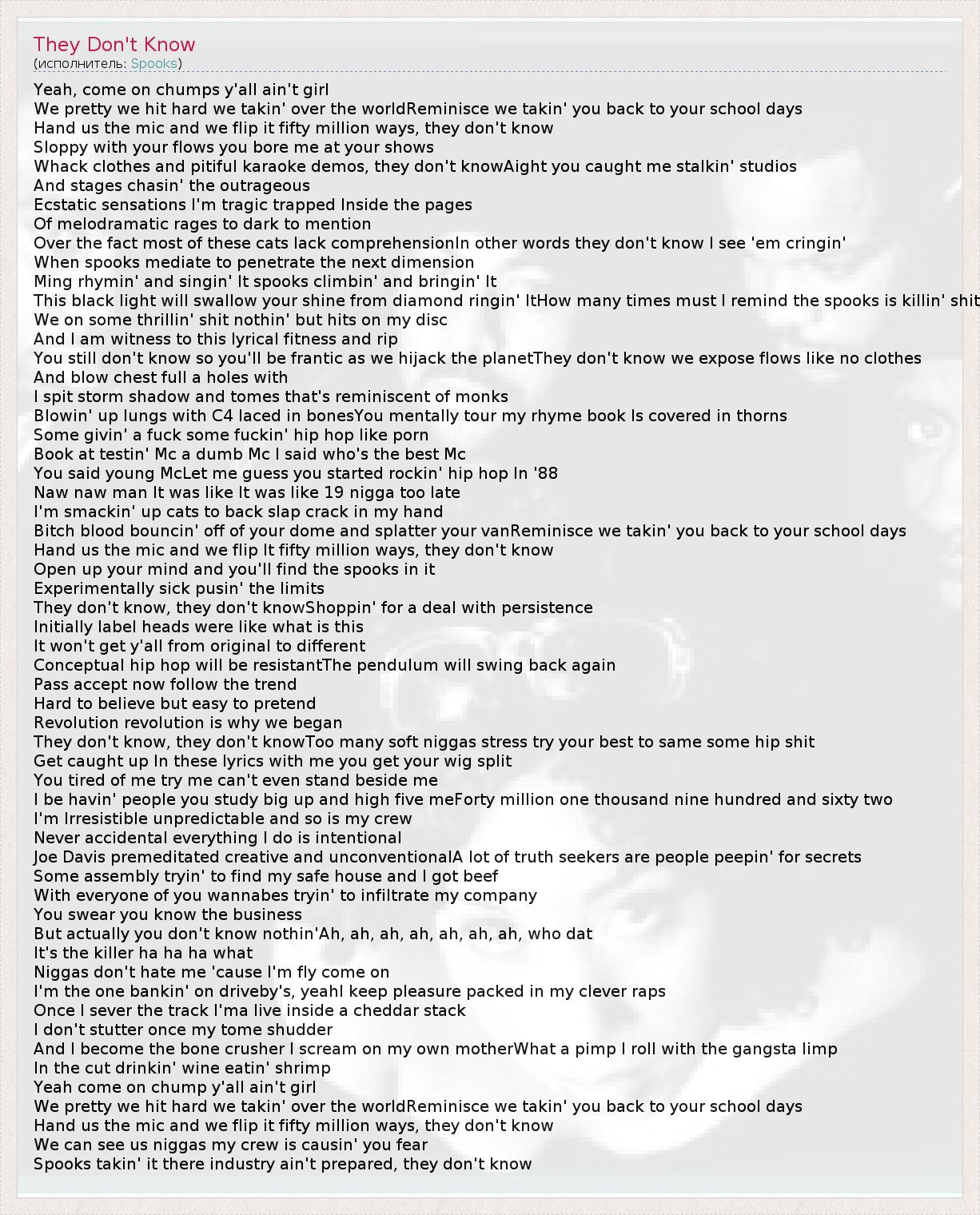 They don't know, they don't knowToo many soft niggas stress try your best to same some hip shit