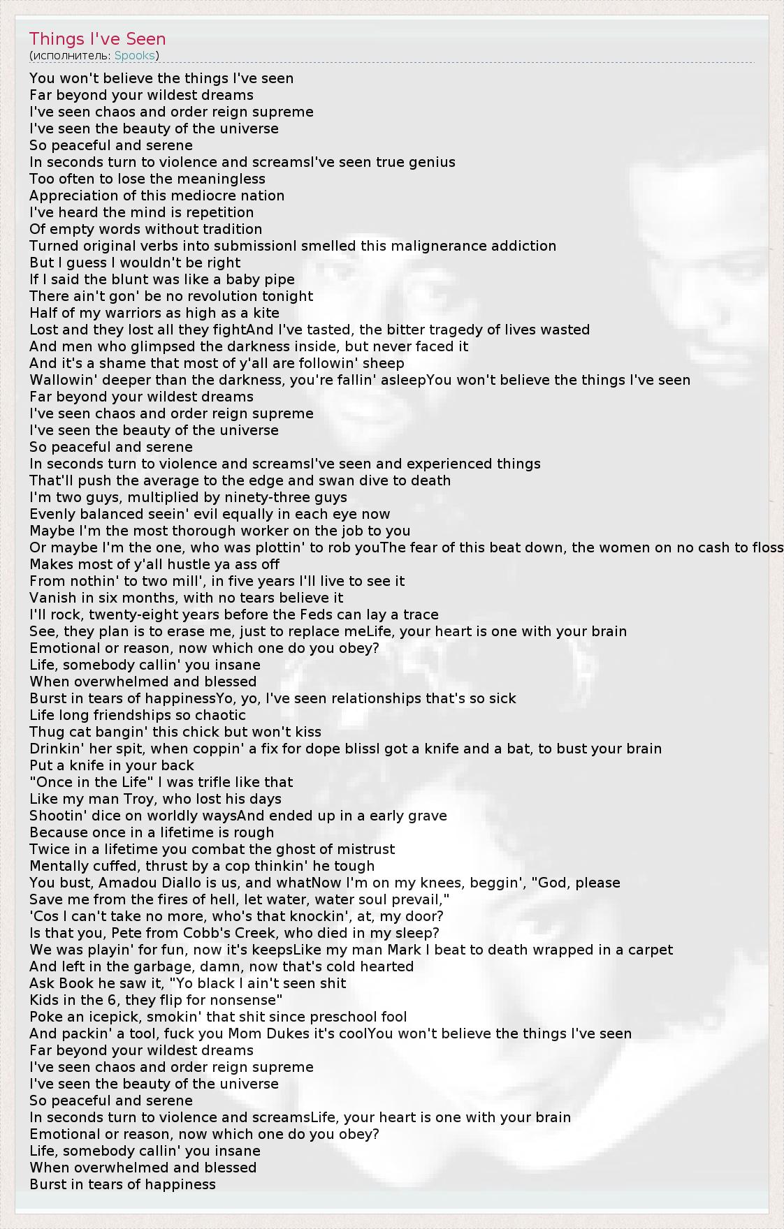 You won't believe the things I've seen Far beyond your wildest dreams I've seen chaos and order reign supreme I've seen the beauty of the universe So peaceful and serene In seconds turn to violence and screamsI've seen true genius Too often to lose the meaningless Appreciation of this mediocre nation I've heard the mind is repetition Of empty words without tradition Turned original verbs into submissionI smelled this malignerance addiction But I guess I wouldn't be right If I said the blunt was like a baby pipe There ain't gon' be no revolution tonight Half of my warriors as high as a kite Lost and they lost all they fightAnd I've tasted, the bitter tragedy of lives wasted And men who glimpsed the darkness inside, but never faced it And it's a shame that most of y'all are followin' sheep Wallowin' deeper than the darkness, you're fallin' asleepYou won't believe the things I've seen Far beyond your wildest dreams I've seen chaos and order reign supreme I've seen the beauty of the universe So peaceful and serene In seconds turn to violence and screamsI've seen and experienced things That'll push the average to the edge and swan dive to death I'm two guys, multiplied by ninety-three guys Evenly balanced seein' evil equally in each eye now Maybe I'm the most thorough worker on the job to you Or maybe I'm the one, who was plottin' to rob youThe fear of this beat down, the women on no cash to floss Makes most of y'all hustle ya ass off From nothin' to two mill', in five years I'll live to see it Vanish in six months, with no tears believe it I'll rock, twenty-eight years before the Feds can lay a trace See, they plan is to erase me, just to replace meLife, your heart is one with your brain Emotional or reason, now which one do you obey? Life, somebody callin' you insane When overwhelmed and blessed Burst in tears of happinessYo, yo, I've seen relationships that's so sick Life long friendships so chaotic Thug cat bangin' this chick but won't kiss Drinkin' her spit, when coppin' a fix for dope blissI got a knife and a bat, to bust your brain Put a knife in your back "Once in the Life" I was trifle like that Like my man Troy, who lost his days Shootin' dice on worldly waysAnd ended up in a early grave Because once in a lifetime is rough Twice in a lifetime you combat the ghost of mistrust Mentally cuffed, thrust by a cop thinkin' he tough You bust, Amadou Diallo is us, and whatNow I'm on my knees, beggin', "God, please Save me from the fires of hell, let water, water soul prevail," 'Cos I can't take no more, who's that knockin', at, my door? Is that you, Pete from Cobb's Creek, who died in my sleep? We was playin' for fun, now it's keepsLike my man Mark I beat to death wrapped in a carpet And left in the garbage, damn, now that's cold hearted Ask Book he saw it, "Yo black I ain't seen shit Kids in the 6, they flip for nonsense" Poke an icepick, smokin' that shit since preschool fool And packin' a tool, fuck you Mom Dukes it's coolYou won't believe the things I've seen Far beyond your wildest dreams I've seen chaos and order reign supreme I've seen the beauty of the universe So peaceful and serene In seconds turn to violence and screamsLife, your heart is one with your brain Emotional or reason, now which one do you obey? Life, somebody callin' you insane When overwhelmed and blessed Burst in tears of happiness