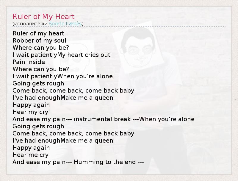 Ruler of my heart Robber of my soul Where can you be? I wait patientlyMy heart cries out Pain inside Where can you be? I wait patientlyWhen you're alone Going gets rough Come back, come back, come back baby I've had enoughMake me a queen Happy again Hear my cry And ease my pain--- instrumental break ---When you're alone Going gets rough Come back, come back, come back baby I've had enoughMake me a queen Happy again Hear me cry And ease my pain--- Humming to the end ---