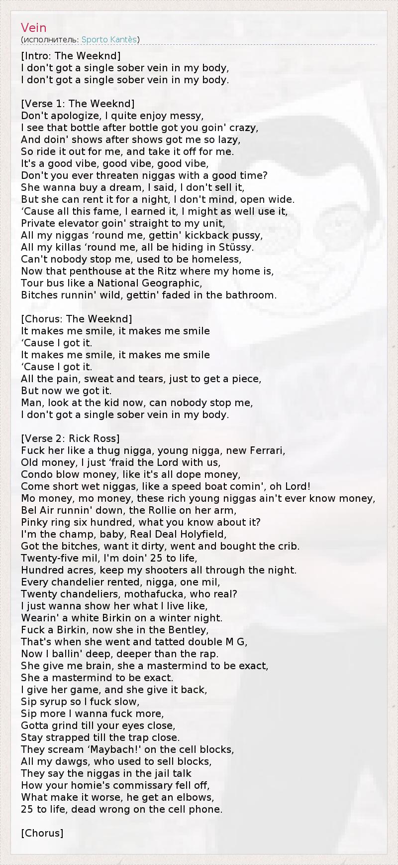 [Вступление: The Weeknd] У меня в теле ни единой чистой вены, У меня в теле ни единой чистой вены. [Куплет 1: The Weeknd] Не извиняйся, мне вполне нравится беспорядок, Вижу, от выпивки у тебя постепенно съезжает крыша, А от концертов я совсем обленился, Ну, так дай мне, раздевайся для меня. Отличный настрой, отличный темп, отличный музон, Ты что, никогда не общалась с черномазыми, которые на коне? Она хочет купить мечту, я ответил, что не продаю их, Но не возражаю, если арендует одну на ночь. Раздвигай ноги шире. Ведь я заслужил всю эту славу и могу пользоваться ею, Частный лифт поднимается прямиком в мои апартаменты, Все мои ниггеры получают от меня киски б/у, Все мои киллеры скрываются в одежде Стюсси. 1 Никому не остановить меня; раньше я был бездомным, А теперь этот пентхаус в "Ритц" – моё жилище. 2 Концертный автобус, как номер журнала "National Geographic", 3 С**ки сходят с ума, курят дурь в туалете. [Припев: The Weeknd] Я смотрю на это и улыбаюсь, и улыбаюсь, Ведь у меня есть всё. Я смотрю на это и улыбаюсь, и улыбаюсь, Ведь у меня есть всё. Были боль, пот и слёзы ради куска хлеба, Но теперь у нас есть всё. Чувак, глянь на меня сейчас, никому не остановить меня, У меня в теле ни единой чистой вены. [Куплет 2: Rick Ross] Тр**аю её, как бандит, у молодого ниггера новая "Феррари", Старые деньги, я лишь боюсь, что бог видит нас, Я выложил деньги за квартиру, будто наварил их все с наркотиков, Трусливые черномазые не достигли целей, а я пру, как гоночный катер, боже мой! Больше денег, больше денег, эти черномазые мажоры даже ничего не знают про деньги, Едем по Бел Эйру, 4 на её руке "Ролекс", Кольцо на мизинце за шестьсот тысяч, что вы в этом понимаете? Я чемпион, детка, Рил Дил Холифилд, 5 У меня есть шл**ки, они хотят пошлостей, так что я пошёл и купил квартиру. Двадцать пять лямов, я буду мотать от двадцати пяти до пожизненного, Сто акров, 6 всю ночь меня охраняют стрелки́. Все канделябры взяты напрокат, ниггер, по миллиону каждый, Двадцать канделябров, го**юк, и кто тут чёткий? Я просто хочу показать ей, как я живу, Она ходит с белой "Биркин" в зимнюю ночь. 7 Да на х** "Биркин", сейчас она ездит в "Бентли", Тогда-то она и сделала татуировку, две "М" и "G", 8 Теперь я транжирю по-крупному, это глубже чем рэп. Она делает мне минет, если точнее она вдох-новительница, Если точнее она вдох-новительница. Я предлагал ей присоединиться, она отказалась, Выпил сиропа, 9 так что е**сь медленно, Выпил больше – хочу е**ться больше, Надо долбить, пока у тебя не закроются глаза, Надо быть при оружии, пока не закрылся притон. В тюремных камерах кричат "Maybach!", А мои братки, что торговали наркотой, Слышали, как на зоне говорят, Что у твоего кореша сорвались поставки, И, что хуже, он скурился, Ему впаяли пожизненное: не стоило говорить о делах по сотовому. [Припев] 1 – Stüssy – американская марка модной одежды, широко признанная в хип-хоп сообществе. 2 – Ritz-Carlton – международная сеть отелей класса "люкс". Сеть находится в собственности и управляется компанией Ritz-Carlton Hotel Company, дочерней компанией крупнейшего в мире гостиничного холдинга Marriott International. 3 – National Geographic Magazine – официальное издание Национального географического общества, основанное в октябре 1888 года; журнал издаётся в нескольких странах и на разных языках, специализируется на статьях о географии, природе, истории, науке и культуре, материалы снабжаются большим количеством фотографий. 4 – Фешенебельны