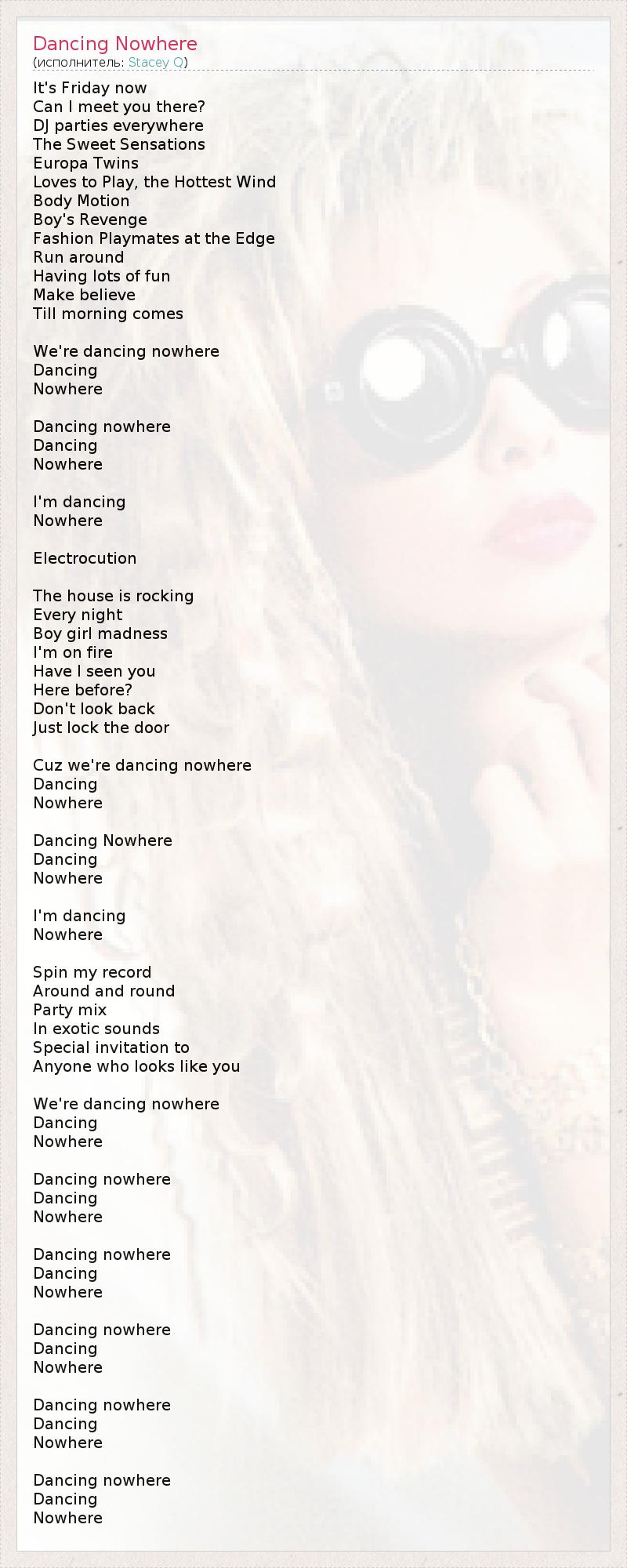 It's Friday now Can I meet you there? DJ parties everywhere The Sweet Sensations Europa Twins Loves to Play, the Hottest Wind Body Motion Boy's Revenge Fashion Playmates at the Edge Run around Having lots of fun Make believe Till morning comes We're dancing nowhere Dancing Nowhere Dancing nowhere Dancing Nowhere I'm dancing Nowhere Electrocution The house is rocking Every night Boy girl madness I'm on fire Have I seen you Here before? Don't look back Just lock the door Cuz we're dancing nowhere Dancing Nowhere Dancing Nowhere Dancing Nowhere I'm dancing Nowhere Spin my record Around and round Party mix In exotic sounds Special invitation to Anyone who looks like you We're dancing nowhere Dancing Nowhere Dancing nowhere Dancing Nowhere Dancing nowhere Dancing Nowhere Dancing nowhere Dancing Nowhere Dancing nowhere Dancing Nowhere Dancing nowhere Dancing Nowhere
