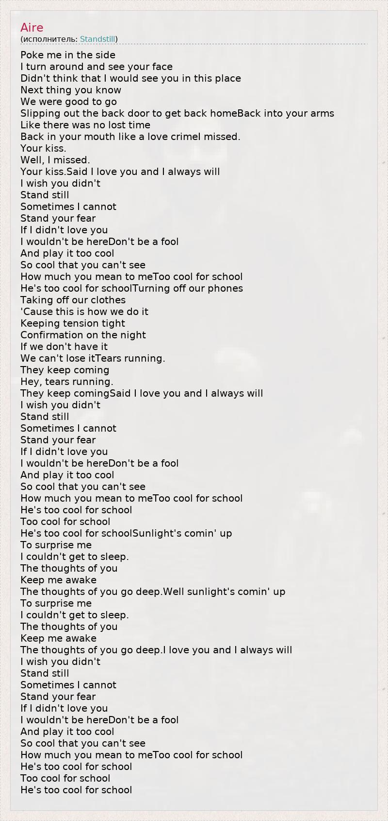 Poke me in the side I turn around and see your face Didn't think that I would see you in this place Next thing you know We were good to go Slipping out the back door to get back homeBack into your arms Like there was no lost time Back in your mouth like a love crimeI missed. Your kiss. Well, I missed. Your kiss.Said I love you and I always will I wish you didn't Stand still Sometimes I cannot Stand your fear If I didn't love you I wouldn't be hereDon't be a fool And play it too cool So cool that you can't see How much you mean to meToo cool for school He's too cool for schoolTurning off our phones Taking off our clothes 'Cause this is how we do it Keeping tension tight Confirmation on the night If we don't have it We can't lose itTears running. They keep coming Hey, tears running. They keep comingSaid I love you and I always will I wish you didn't Stand still Sometimes I cannot Stand your fear If I didn't love you I wouldn't be hereDon't be a fool And play it too cool So cool that you can't see How much you mean to meToo cool for school He's too cool for school Too cool for school He's too cool for schoolSunlight's comin' up To surprise me I couldn't get to sleep. The thoughts of you Keep me awake The thoughts of you go deep.Well sunlight's comin' up To surprise me I couldn't get to sleep. The thoughts of you Keep me awake The thoughts of you go deep.I love you and I always will I wish you didn't Stand still Sometimes I cannot Stand your fear If I didn't love you I wouldn't be hereDon't be a fool And play it too cool So cool that you can't see How much you mean to meToo cool for school He's too cool for school Too cool for school He's too cool for school