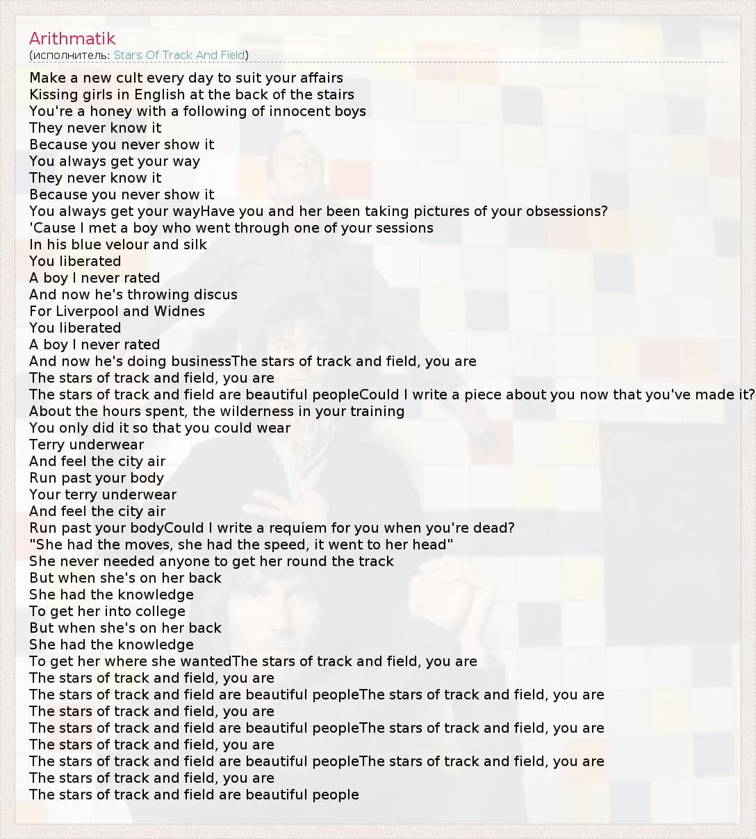 Make a new cult every day to suit your affairs Kissing girls in English at the back of the stairs You're a honey with a following of innocent boys They never know it Because you never show it You always get your way They never know it Because you never show it You always get your wayHave you and her been taking pictures of your obsessions? 'Cause I met a boy who went through one of your sessions In his blue velour and silk You liberated A boy I never rated And now he's throwing discus For Liverpool and Widnes You liberated A boy I never rated And now he's doing businessThe stars of track and field, you are The stars of track and field, you are The stars of track and field are beautiful peopleCould I write a piece about you now that you've made it? About the hours spent, the wilderness in your training You only did it so that you could wear Terry underwear And feel the city air Run past your body Your terry underwear And feel the city air Run past your bodyCould I write a requiem for you when you're dead? "She had the moves, she had the speed, it went to her head" She never needed anyone to get her round the track But when she's on her back She had the knowledge To get her into college But when she's on her back She had the knowledge To get her where she wantedThe stars of track and field, you are The stars of track and field, you are The stars of track and field are beautiful peopleThe stars of track and field, you are The stars of track and field, you are The stars of track and field are beautiful peopleThe stars of track and field, you are The stars of track and field, you are The stars of track and field are beautiful peopleThe stars of track and field, you are The stars of track and field, you are The stars of track and field are beautiful people