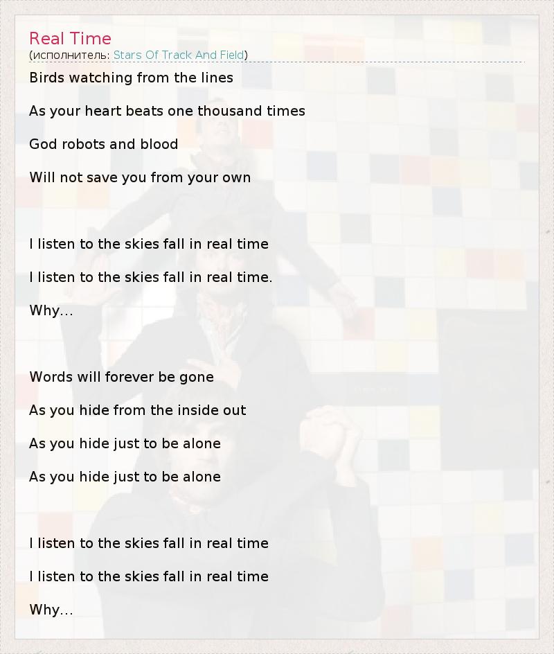 Birds watching from the lines As your heart beats one thousand times God robots and blood Will not save you from your own I listen to the skies fall in real time I listen to the skies fall in real time. Why… Words will forever be gone As you hide from the inside out As you hide just to be alone As you hide just to be alone I listen to the skies fall in real time I listen to the skies fall in real time Why…