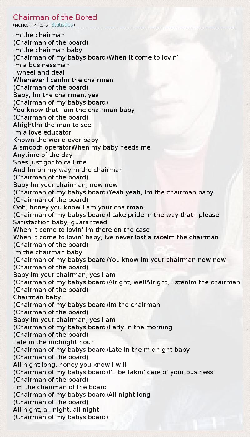 Im the chairman (Chairman of the board) Im the chairman baby (Chairman of my babys board)When it come to lovin' Im a businessman I wheel and deal Whenever I canIm the chairman (Chairman of the board) Baby, Im the chairman, yea (Chairman of my babys board) You know that I am the chairman baby (Chairman of the board) AlrightIm the man to see Im a love educator Known the world over baby A smooth operatorWhen my baby needs me Anytime of the day Shes just got to call me And Im on my wayIm the chairman (Chairman of the board) Baby Im your chairman, now now (Chairman of my babys board)Yeah yeah, Im the chairman baby (Chairman of the board) Ooh, honey you know I am your chairman (Chairman of my babys board)I take pride in the way that I please Satisfaction baby, guaranteed When it come to lovin' Im there on the case When it come to lovin' baby, Ive never lost a raceIm the chairman (Chairman of the board) Im the chairman baby (Chairman of my babys board)You know Im your chairman now now (Chairman of the board) Baby Im your chairman, yes I am (Chairman of my babys board)Alright, wellAlright, listenIm the chairman (Chairman of the board) Chairman baby (Chairman of my babys board)Im the chairman (Chairman of the board) Baby Im your chairman, yes I am (Chairman of my babys board)Early in the morning (Chairman of the board) Late in the midnight hour (Chairman of my babys board)Late in the midnight baby (Chairman of the board) All night long, honey you know I will (Chairman of my babys board)I'll be takin' care of your business (Chairman of the board) I'm the chairman of the board (Chairman of my babys board)All night long (Chairman of the board) All night, all night, all night (Chairman of my babys board)