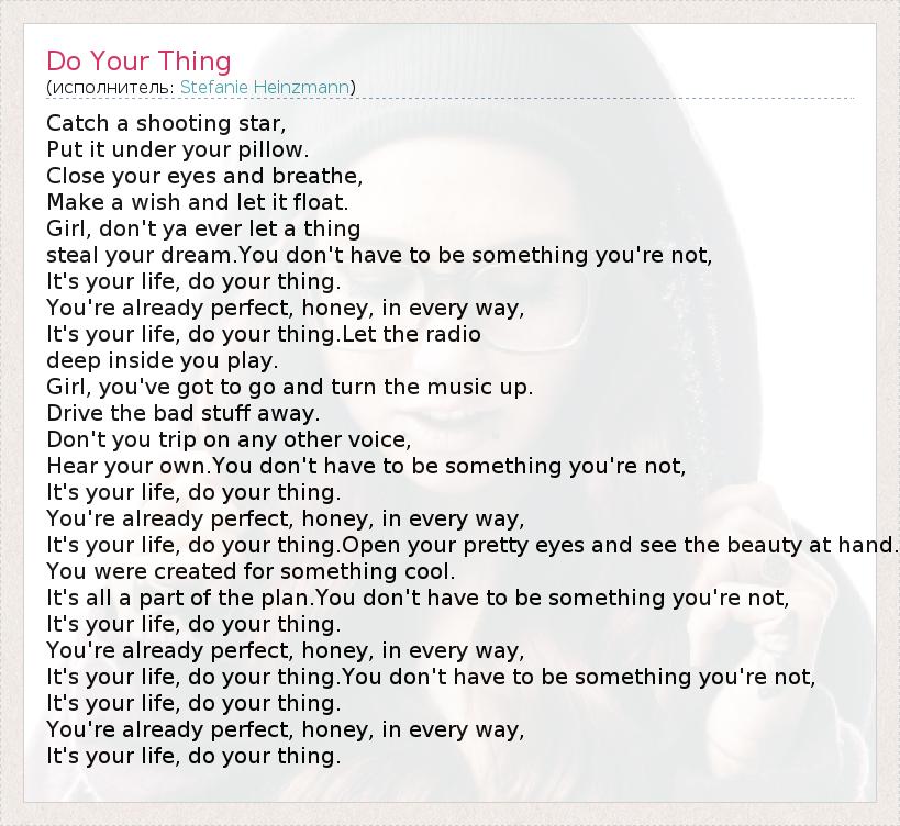 Catch a shooting star, Put it under your pillow. Close your eyes and breathe, Make a wish and let it float. Girl, don't ya ever let a thing steal your dream.You don't have to be something you're not, It's your life, do your thing. You're already perfect, honey, in every way, It's your life, do your thing.Let the radio deep inside you play. Girl, you've got to go and turn the music up. Drive the bad stuff away. Don't you trip on any other voice, Hear your own.You don't have to be something you're not, It's your life, do your thing. You're already perfect, honey, in every way, It's your life, do your thing.Open your pretty eyes and see the beauty at hand. You were created for something cool. It's all a part of the plan.You don't have to be something you're not, It's your life, do your thing. You're already perfect, honey, in every way, It's your life, do your thing.You don't have to be something you're not, It's your life, do your thing. You're already perfect, honey, in every way, It's your life, do your thing.