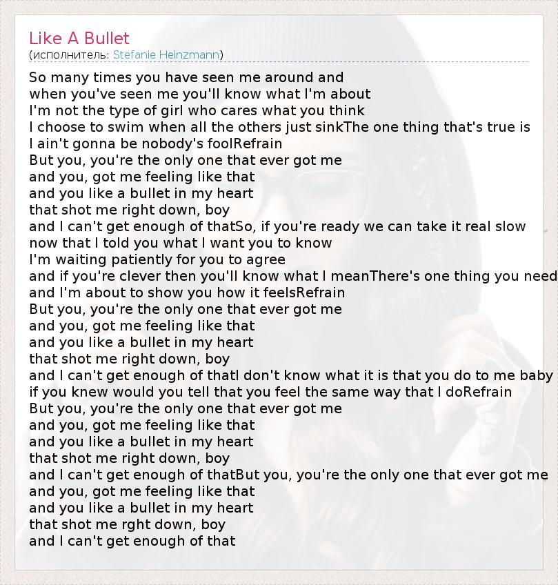So many times you have seen me around and when you've seen me you'll know what I'm about I'm not the type of girl who cares what you think I choose to swim when all the others just sinkThe one thing that's true is I ain't gonna be nobody's foolRefrain But you, you're the only one that ever got me and you, got me feeling like that and you like a bullet in my heart that shot me right down, boy and I can't get enough of thatSo, if you're ready we can take it real slow now that I told you what I want you to know I'm waiting patiently for you to agree and if you're clever then you'll know what I meanThere's one thing you need and I'm about to show you how it feelsRefrain But you, you're the only one that ever got me and you, got me feeling like that and you like a bullet in my heart that shot me right down, boy and I can't get enough of thatI don't know what it is that you do to me baby if you knew would you tell that you feel the same way that I doRefrain But you, you're the only one that ever got me and you, got me feeling like that and you like a bullet in my heart that shot me right down, boy and I can't get enough of thatBut you, you're the only one that ever got me and you, got me feeling like that and you like a bullet in my heart that shot me rght down, boy and I can't get enough of that