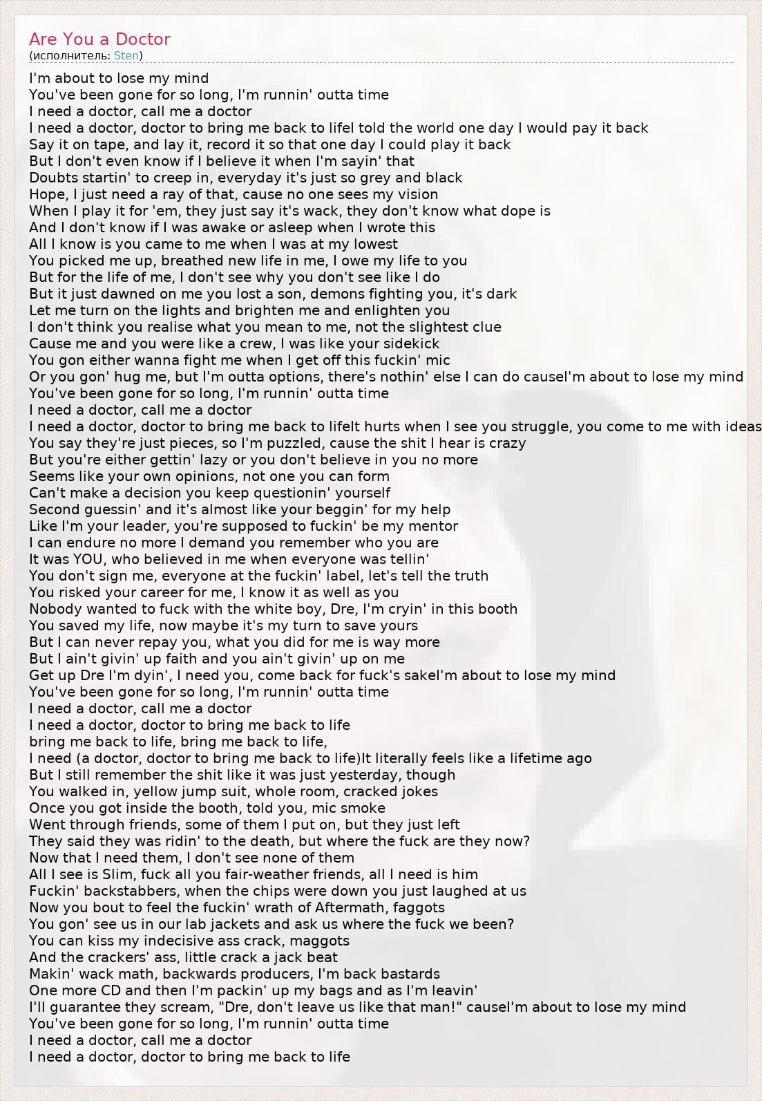 I'm about to lose my mind You've been gone for so long, I'm runnin' outta time I need a doctor, call me a doctor I need a doctor, doctor to bring me back to lifeI told the world one day I would pay it back Say it on tape, and lay it, record it so that one day I could play it back But I don't even know if I believe it when I'm sayin' that Doubts startin' to creep in, everyday it's just so grey and black Hope, I just need a ray of that, cause no one sees my vision When I play it for 'em, they just say it's wack, they don't know what dope is And I don't know if I was awake or asleep when I wrote this All I know is you came to me when I was at my lowest You picked me up, breathed new life in me, I owe my life to you But for the life of me, I don't see why you don't see like I do But it just dawned on me you lost a son, demons fighting you, it's dark Let me turn on the lights and brighten me and enlighten you I don't think you realise what you mean to me, not the slightest clue Cause me and you were like a crew, I was like your sidekick You gon either wanna fight me when I get off this fuckin' mic Or you gon' hug me, but I'm outta options, there's nothin' else I can do causeI'm about to lose my mind You've been gone for so long, I'm runnin' outta time I need a doctor, call me a doctor I need a doctor, doctor to bring me back to lifeIt hurts when I see you struggle, you come to me with ideas You say they're just pieces, so I'm puzzled, cause the shit I hear is crazy But you're either gettin' lazy or you don't believe in you no more Seems like your own opinions, not one you can form Can't make a decision you keep questionin' yourself Second guessin' and it's almost like your beggin' for my help Like I'm your leader, you're supposed to fuckin' be my mentor I can endure no more I demand you remember who you are It was YOU, who believed in me when everyone was tellin' You don't sign me, everyone at the fuckin' label, let's tell the truth You risked your career for me, I know it as well as you Nobody wanted to fuck with the white boy, Dre, I'm cryin' in this booth You saved my life, now maybe it's my turn to save yours But I can never repay you, what you did for me is way more But I ain't givin' up faith and you ain't givin' up on me Get up Dre I'm dyin', I need you, come back for fuck's sakeI'm about to lose my mind You've been gone for so long, I'm runnin' outta time I need a doctor, call me a doctor I need a doctor, doctor to bring me back to life bring me back to life, bring me back to life, I need (a doctor, doctor to bring me back to life)It literally feels like a lifetime ago But I still remember the shit like it was just yesterday, though You walked in, yellow jump suit, whole room, cracked jokes Once you got inside the booth, told you, mic smoke Went through friends, some of them I put on, but they just left They said they was ridin' to the death, but where the fuck are they now? Now that I need them, I don't see none of them All I see is Slim, fuck all you fair-weather friends, all I need is him Fuckin' backstabbers, when the chips were down you just laughed at us Now you bout to feel the fuckin' wrath of Aftermath, faggots You gon' see us in our lab jackets and ask us where the fuck we been? You can kiss my indecisive ass crack, maggots And the crackers' ass, little crack a jack beat Makin' wack math, backwards producers, I'm back bastards One more CD and then I'm packin' up my bags and as I'm leavin' I'll guarantee they scream, "Dre, don't leave us like that man!" causeI'm about to lose my mind You've been gone for so long, I'm runnin' outta time I need a doctor, call me a doctor I need a doctor, doctor to bring me back to life