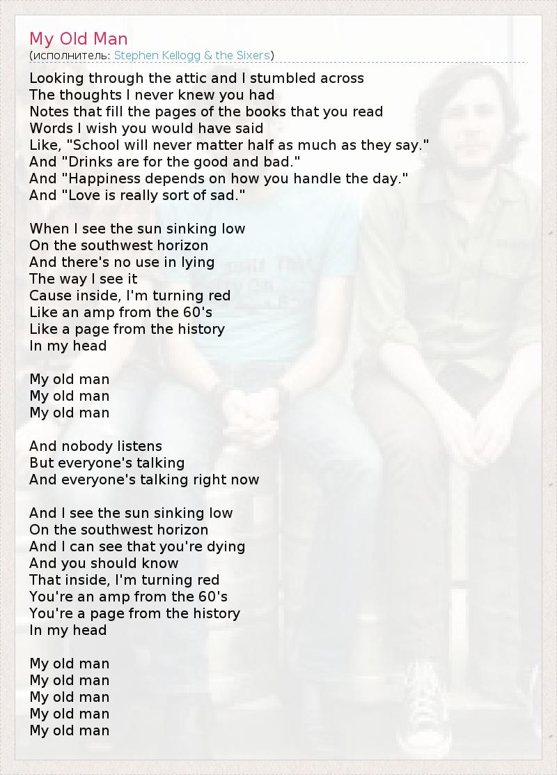 Looking through the attic and I stumbled across The thoughts I never knew you had Notes that fill the pages of the books that you read Words I wish you would have said Like, "School will never matter half as much as they say." And "Drinks are for the good and bad." And "Happiness depends on how you handle the day." And "Love is really sort of sad." When I see the sun sinking low On the southwest horizon And there's no use in lying The way I see it Cause inside, I'm turning red Like an amp from the 60's Like a page from the history In my head My old man My old man My old man And nobody listens But everyone's talking And everyone's talking right now And I see the sun sinking low On the southwest horizon And I can see that you're dying And you should know That inside, I'm turning red You're an amp from the 60's You're a page from the history In my head My old man My old man My old man My old man My old man