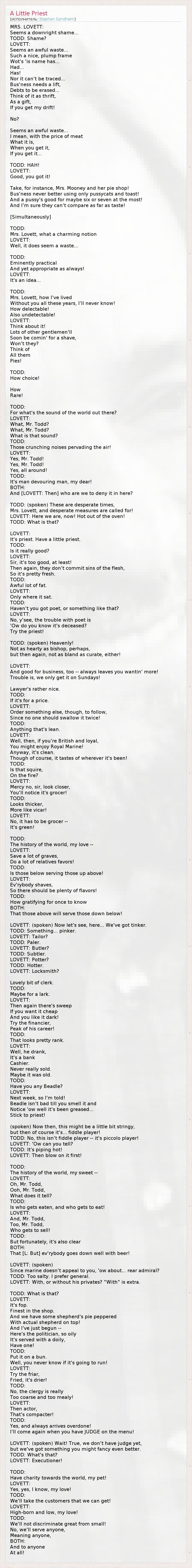 MRS. LOVETT: Seems a downright shame... TODD: Shame? LOVETT: Seems an awful waste... Such a nice, plump frame Wot's 'is name has... Had... Has! Nor it can't be traced... Bus'ness needs a lift, Debts to be erased... Think of it as thrift, As a gift, If you get my drift! No? Seems an awful waste... I mean, with the price of meat What it is, When you get it, If you get it... TODD: HAH! LOVETT: Good, you got it! Take, for instance, Mrs. Mooney and her pie shop! Bus'ness never better using only pussycats and toast! And a pussy's good for maybe six or seven at the most! And I'm sure they can't compare as far as taste! [Simultaneously] TODD: Mrs. Lovett, what a charming notion LOVETT: Well, it does seem a waste... TODD: Eminently practical And yet appropriate as always! LOVETT: It's an idea... TODD: Mrs. Lovett, how I've lived Without you all these years, I'll never know! How delectable! Also undetectable! LOVETT: Think about it! Lots of other gentlemen'll Soon be comin' for a shave, Won't they? Think of All them Pies! TODD: How choice! How Rare! TODD: For what's the sound of the world out there? LOVETT: What, Mr. Todd? What, Mr. Todd? What is that sound? TODD: Those crunching noises pervading the air! LOVETT: Yes, Mr. Todd! Yes, Mr. Todd! Yes, all around! TODD: It's man devouring man, my dear! BOTH: And [LOVETT: Then] who are we to deny it in here? TODD: (spoken) These are desperate times, Mrs. Lovett, and desperate measures are called for! LOVETT: Here we are, now! Hot out of the oven! TODD: What is that? LOVETT: It's priest. Have a little priest. TODD: Is it really good? LOVETT: Sir, it's too good, at least! Then again, they don't commit sins of the flesh, So it's pretty fresh. TODD: Awful lot of fat. LOVETT: Only where it sat. TODD: Haven't you got poet, or something like that? LOVETT: No, y'see, the trouble with poet is 'Ow do you know it's deceased? Try the priest! TODD: (spoken) Heavenly! Not as hearty as bishop, perhaps, but then again, not as bland as curate, either! LOVETT: And good for business, too -- always leaves you wantin' more! Trouble is, we only get it on Sundays! Lawyer's rather nice. TODD: If it's for a price. LOVETT: Order something else, though, to follow, Since no one should swallow it twice! TODD: Anything that's lean. LOVETT: Well, then, if you're British and loyal, You might enjoy Royal Marine! Anyway, it's clean. Though of course, it tastes of wherever it's been! TODD: Is that squire, On the fire? LOVETT: Mercy no, sir, look closer, You'll notice it's grocer! TODD: Looks thicker, More like vicar! LOVETT: No, it has to be grocer -- It's green! TODD: The history of the world, my love -- LOVETT: Save a lot of graves, Do a lot of relatives favors! TODD: Is those below serving those up above! LOVETT: Ev'rybody shaves, So there should be plenty of flavors! TODD: How gratifying for once to know BOTH: That those above will serve those down below! LOVETT: (spoken) Now let's see, here... We've got tinker. TODD: Something... pinker. LOVETT: Tailor? TODD: Paler. LOVETT: Butler? TODD: Subtler. LOVETT: Potter? TODD: Hotter. LOVETT: Locksmith? Lovely bit of clerk. TODD: Maybe for a lark. LOVETT: Then again there's sweep If you want it cheap And you like it dark! Try the financier, Peak of his career! TODD: That looks pretty rank. LOVETT: Well, he drank, It's a bank Cashier. Never really sold. Maybe it was old. TODD: Have you any Beadle? LOVETT: Next week, so I'm told! Beadle isn't bad till you smell it and Notice 'ow well it's been greased... Stick to priest! (spoken) Now then, this might be a little bit stringy, but then of course it's... fiddle player! TODD: No, this isn't fiddle player -- it's piccolo player! LOVETT: 'Ow can you tell? TODD: It's piping hot! LOVETT: Then blow on it first! TODD: The history of the world, my sweet -- LOVETT: Oh, Mr. Todd, Ooh, Mr. Todd, What does it tell? TODD: Is who gets eaten, and who gets to eat! LOVETT: And, Mr. Todd, Too, Mr. Todd, Who gets to sell! TODD: But fortunately, it's also clear BOTH: That [L: But] ev'rybody goes down well with beer! LOVETT: (spoken) Since marine doesn't appeal to you, 'ow about... rear admiral? TODD: Too salty. I prefer general. LOVETT: With, or without his privates? "With" is extra. TODD: What is that? LOVETT: It's fop. Finest in the shop. And we have some shepherd's pie peppered With actual shepherd on top! And I've just begun -- Here's the politician, so oily It's served with a doily, Have one! TODD: Put it on a bun. Well, you never know if it's going to run! LOVETT: Try the friar, Fried, it's drier! TODD: No, the clergy is really Too coarse and too mealy! LOVETT: Then actor, That's compacter! TODD: Yes, and always arrives overdone! I'll come again when you have JUDGE on the menu! LOVETT: (spoken) Wait! True, we don't have judge yet, but we've got something you might fancy even better. TODD: What's that? LOVETT: Executioner! TODD: Have charity towards the world, my pet! LOVETT: Yes, yes, I know, my love! TODD: We'll take the customers that we can get! LOVETT: High-born and low, my love! TODD: We'll not discriminate great from small! No, we'll serve anyone, Meaning anyone, BOTH: And to anyone At all!