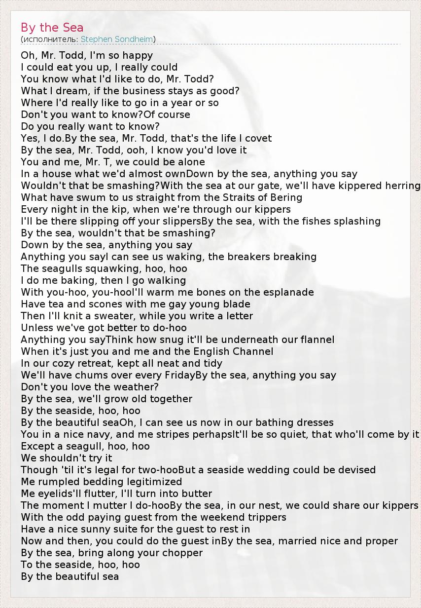 Oh, Mr. Todd, I'm so happy I could eat you up, I really could You know what I'd like to do, Mr. Todd? What I dream, if the business stays as good? Where I'd really like to go in a year or so Don't you want to know?Of course Do you really want to know? Yes, I do.By the sea, Mr. Todd, that's the life I covet By the sea, Mr. Todd, ooh, I know you'd love it You and me, Mr. T, we could be alone In a house what we'd almost ownDown by the sea, anything you say Wouldn't that be smashing?With the sea at our gate, we'll have kippered herring What have swum to us straight from the Straits of Bering Every night in the kip, when we're through our kippers I'll be there slipping off your slippersBy the sea, with the fishes splashing By the sea, wouldn't that be smashing? Down by the sea, anything you say Anything you sayI can see us waking, the breakers breaking The seagulls squawking, hoo, hoo I do me baking, then I go walking With you-hoo, you-hooI'll warm me bones on the esplanade Have tea and scones with me gay young blade Then I'll knit a sweater, while you write a letter Unless we've got better to do-hoo Anything you sayThink how snug it'll be underneath our flannel When it's just you and me and the English Channel In our cozy retreat, kept all neat and tidy We'll have chums over every FridayBy the sea, anything you say Don't you love the weather? By the sea, we'll grow old together By the seaside, hoo, hoo By the beautiful seaOh, I can see us now in our bathing dresses You in a nice navy, and me stripes perhapsIt'll be so quiet, that who'll come by it Except a seagull, hoo, hoo We shouldn't try it Though 'til it's legal for two-hooBut a seaside wedding could be devised Me rumpled bedding legitimized Me eyelids'll flutter, I'll turn into butter The moment I mutter I do-hooBy the sea, in our nest, we could share our kippers With the odd paying guest from the weekend trippers Have a nice sunny suite for the guest to rest in Now and then, you could do the guest inBy the sea, married nice and proper By the sea, bring along your chopper To the seaside, hoo, hoo By the beautiful sea
