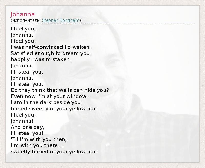 I feel you, Johanna. I feel you. I was half-convinced I'd waken. Satisfied enough to dream you, happily I was mistaken, Johanna. I'll steal you, Johanna, I'll steal you. Do they think that walls can hide you? Even now I'm at your window... I am in the dark beside you, buried sweetly in your yellow hair! I feel you, Johanna! And one day, I'll steal you! 'Til I'm with you then, I'm with you there... sweetly buried in your yellow hair!