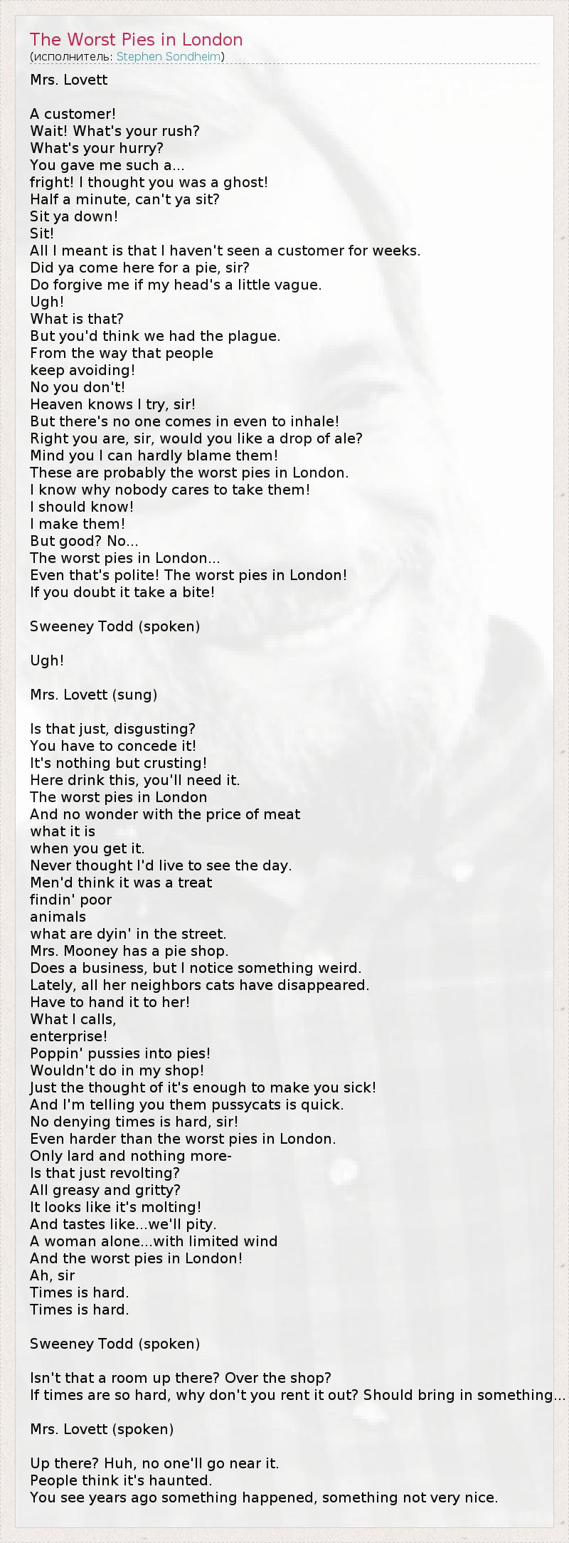 Mrs. Lovett A customer! Wait! What's your rush? What's your hurry? You gave me such a... fright! I thought you was a ghost! Half a minute, can't ya sit? Sit ya down! Sit! All I meant is that I haven't seen a customer for weeks. Did ya come here for a pie, sir? Do forgive me if my head's a little vague. Ugh! What is that? But you'd think we had the plague. From the way that people keep avoiding! No you don't! Heaven knows I try, sir! But there's no one comes in even to inhale! Right you are, sir, would you like a drop of ale? Mind you I can hardly blame them! These are probably the worst pies in London. I know why nobody cares to take them! I should know! I make them! But good? No... The worst pies in London... Even that's polite! The worst pies in London! If you doubt it take a bite! Sweeney Todd (spoken) Ugh! Mrs. Lovett (sung) Is that just, disgusting? You have to concede it! It's nothing but crusting! Here drink this, you'll need it. The worst pies in London And no wonder with the price of meat what it is when you get it. Never thought I'd live to see the day. Men'd think it was a treat findin' poor animals what are dyin' in the street. Mrs. Mooney has a pie shop. Does a business, but I notice something weird. Lately, all her neighbors cats have disappeared. Have to hand it to her! What I calls, enterprise! Poppin' pussies into pies! Wouldn't do in my shop! Just the thought of it's enough to make you sick! And I'm telling you them pussycats is quick. No denying times is hard, sir! Even harder than the worst pies in London. Only lard and nothing more- Is that just revolting? All greasy and gritty? It looks like it's molting! And tastes like...we'll pity. A woman alone...with limited wind And the worst pies in London! Ah, sir Times is hard. Times is hard. Sweeney Todd (spoken) Isn't that a room up there? Over the shop? If times are so hard, why don't you rent it out? Should bring in something... Mrs. Lovett (spoken) Up there? Huh, no one'll go near it. People think it's haunted. You see years ago something happened, something not very nice.