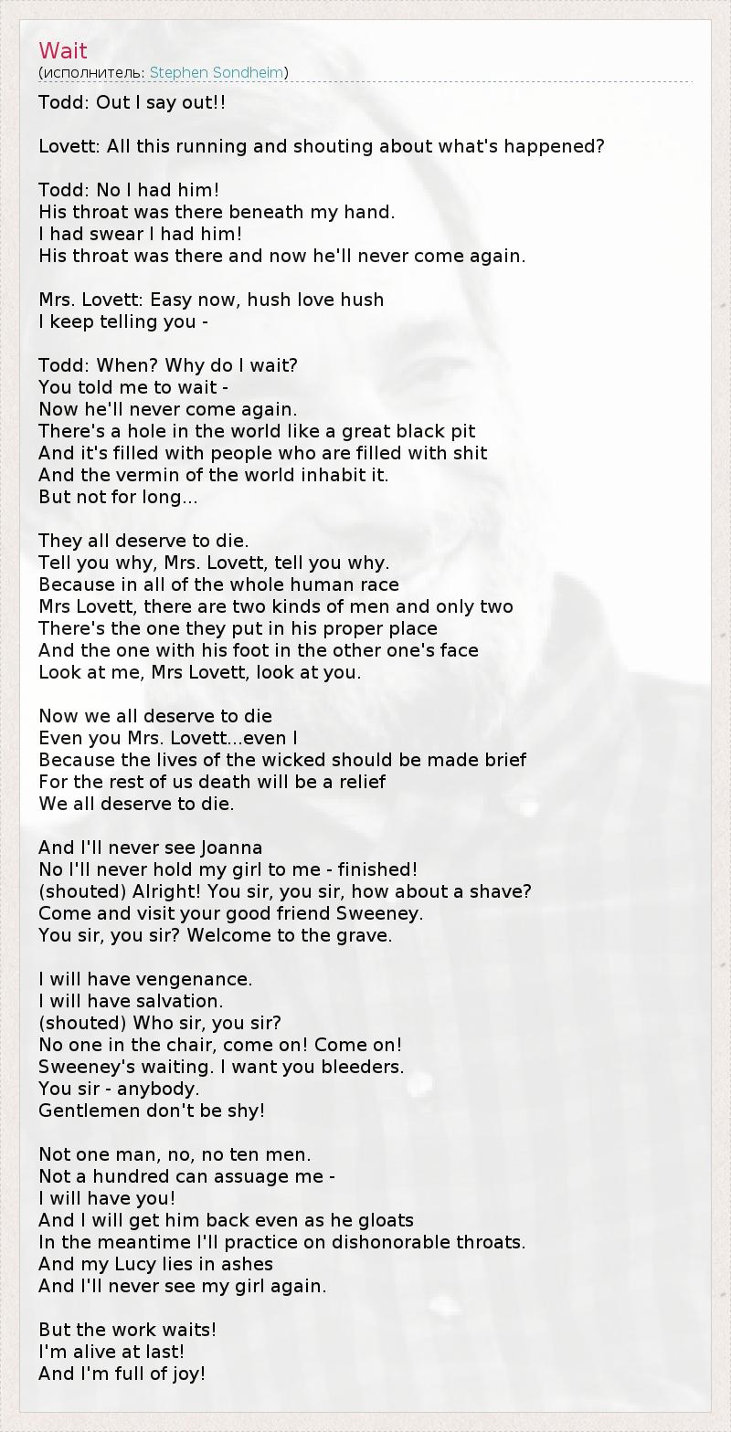 Todd: Out I say out!! Lovett: All this running and shouting about what's happened? Todd: No I had him! His throat was there beneath my hand. I had swear I had him! His throat was there and now he'll never come again. Mrs. Lovett: Easy now, hush love hush I keep telling you - Todd: When? Why do I wait? You told me to wait - Now he'll never come again. There's a hole in the world like a great black pit And it's filled with people who are filled with shit And the vermin of the world inhabit it. But not for long... They all deserve to die. Tell you why, Mrs. Lovett, tell you why. Because in all of the whole human race Mrs Lovett, there are two kinds of men and only two There's the one they put in his proper place And the one with his foot in the other one's face Look at me, Mrs Lovett, look at you. Now we all deserve to die Even you Mrs. Lovett...even I Because the lives of the wicked should be made brief For the rest of us death will be a relief We all deserve to die. And I'll never see Joanna No I'll never hold my girl to me - finished! (shouted) Alright! You sir, you sir, how about a shave? Come and visit your good friend Sweeney. You sir, you sir? Welcome to the grave. I will have vengenance. I will have salvation. (shouted) Who sir, you sir? No one in the chair, come on! Come on! Sweeney's waiting. I want you bleeders. You sir - anybody. Gentlemen don't be shy! Not one man, no, no ten men. Not a hundred can assuage me - I will have you! And I will get him back even as he gloats In the meantime I'll practice on dishonorable throats. And my Lucy lies in ashes And I'll never see my girl again. But the work waits! I'm alive at last! And I'm full of joy!