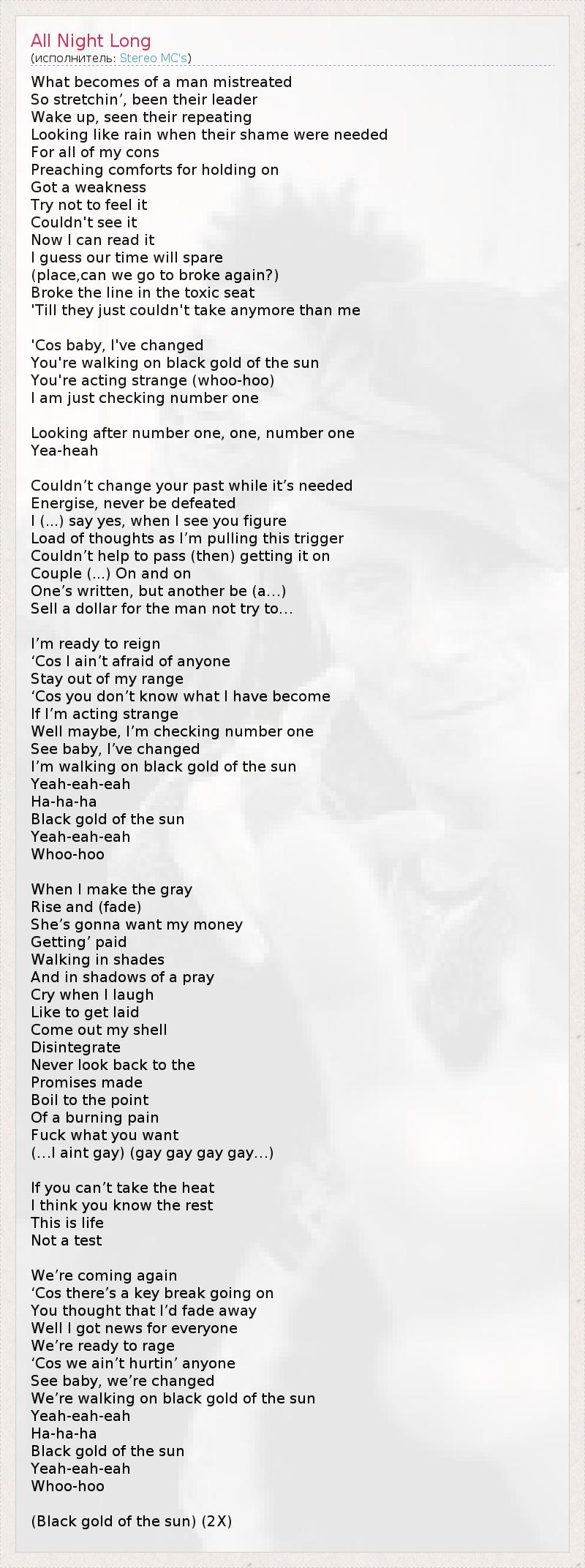 What becomes of a man mistreated So stretchin’, been their leader Wake up, seen their repeating Looking like rain when their shame were needed For all of my cons Preaching comforts for holding on Got a weakness Try not to feel it Couldn't see it Now I can read it I guess our time will spare (place,can we go to broke again?) Broke the line in the toxic seat 'Till they just couldn't take anymore than me 'Cos baby, I've changed You're walking on black gold of the sun You're acting strange (whoo-hoo) I am just checking number one Looking after number one, one, number one Yea-heah Couldn’t change your past while it’s needed Energise, never be defeated I (...) say yes, when I see you figure Load of thoughts as I’m pulling this trigger Couldn’t help to pass (then) getting it on Couple (...) On and on One’s written, but another be (a…) Sell a dollar for the man not try to… I’m ready to reign ‘Cos I ain’t afraid of anyone Stay out of my range ‘Cos you don’t know what I have become If I’m acting strange Well maybe, I’m checking number one See baby, I’ve changed I’m walking on black gold of the sun Yeah-eah-eah Ha-ha-ha Black gold of the sun Yeah-eah-eah Whoo-hoo When I make the gray Rise and (fade) She’s gonna want my money Getting’ paid Walking in shades And in shadows of a pray Cry when I laugh Like to get laid Come out my shell Disintegrate Never look back to the Promises made Boil to the point Of a burning pain Fuck what you want (…I aint gay) (gay gay gay gay…) If you can’t take the heat I think you know the rest This is life Not a test We’re coming again ‘Cos there’s a key break going on You thought that I’d fade away Well I got news for everyone We’re ready to rage ‘Cos we ain’t hurtin’ anyone See baby, we’re changed We’re walking on black gold of the sun Yeah-eah-eah Ha-ha-ha Black gold of the sun Yeah-eah-eah Whoo-hoo (Black gold of the sun) (2X)
