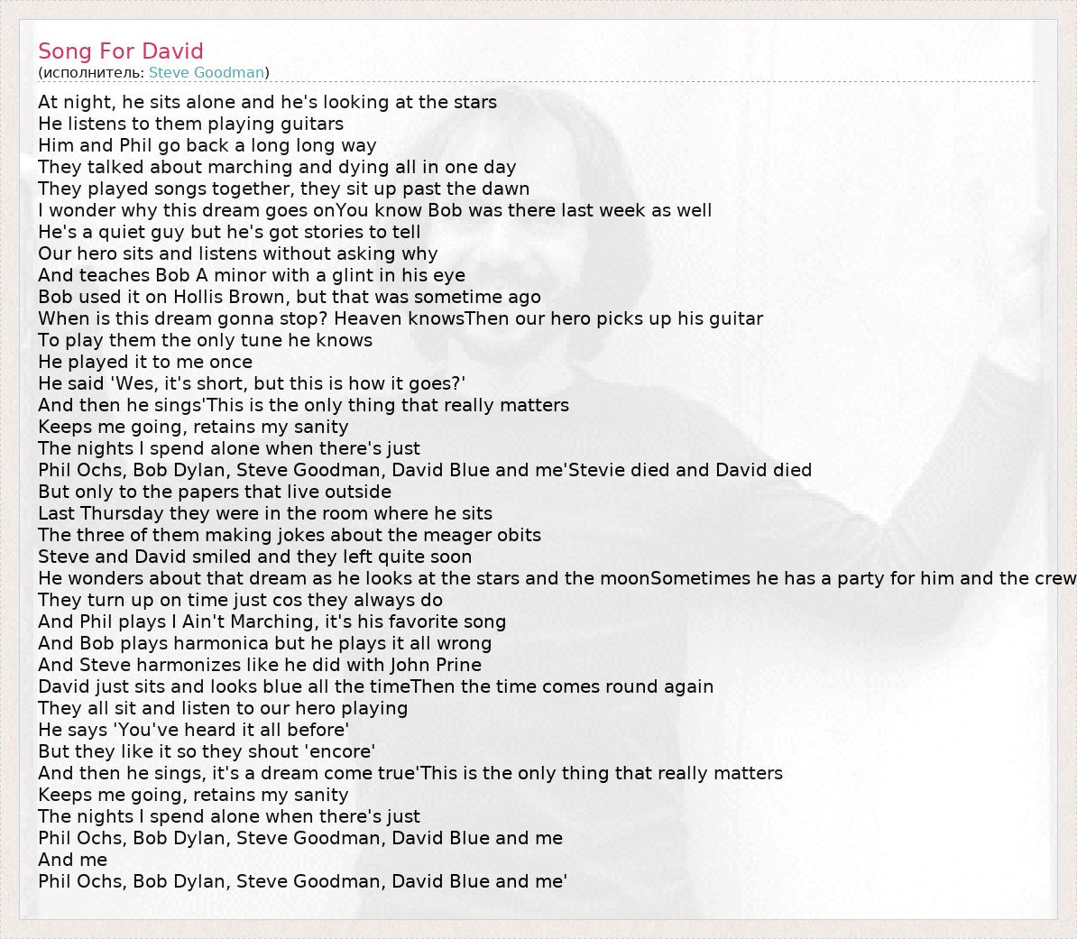 Phil Ochs, Bob Dylan, Steve Goodman, David Blue and me'Stevie died and David died