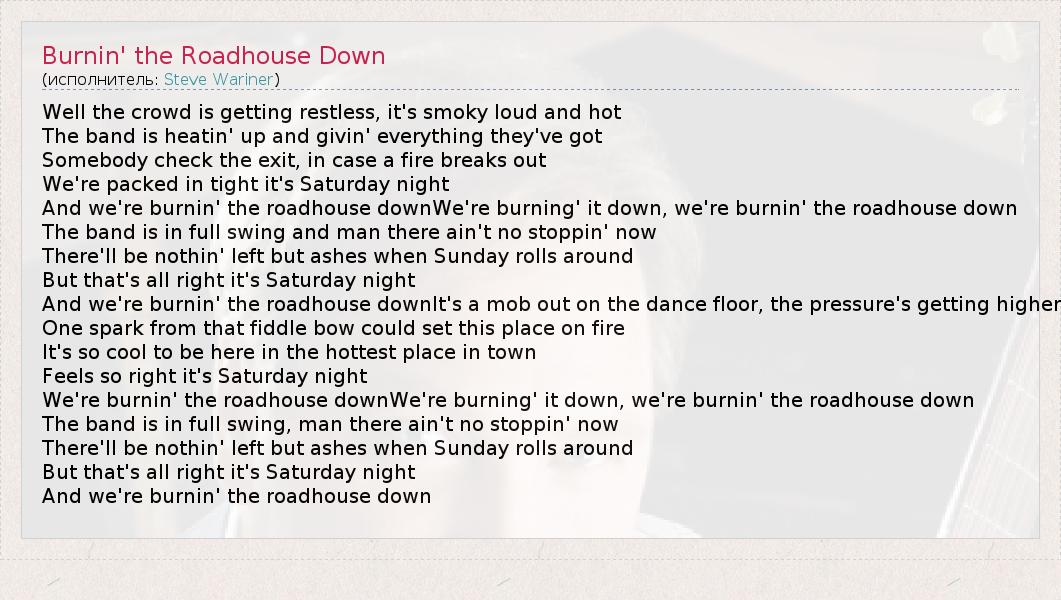 А как ты думаешь, о чем песня "Burnin' the Roadhouse Down" ?