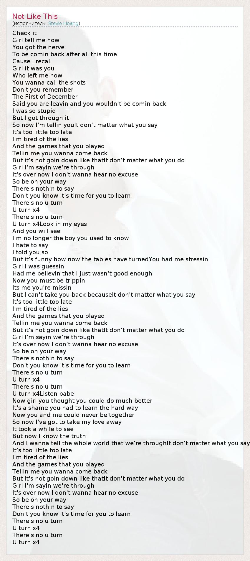 Check it Girl tell me how You got the nerve To be comin back after all this time Cause i recall Girl it was you Who left me now You wanna call the shots Don't you remember The First of December Said you are leavin and you wouldn't be comin back I was so stupid But I got through it So now I'm tellin youIt don't matter what you say It's too little too late I'm tired of the lies And the games that you played Tellin me you wanna come back But it's not goin down like thatIt don't matter what you do Girl I'm sayin we're through It's over now I don't wanna hear no excuse So be on your way There's nothin to say Don't you know it's time for you to learn There's no u turn U turn x4 There's no u turn U turn x4Look in my eyes And you will see I'm no longer the boy you used to know I hate to say I told you so But it's funny how now the tables have turnedYou had me stressin Girl I was guessin Had me believin that I just wasn't good enough Now you must be trippin Its me you're missin But I can't take you back becauseIt don't matter what you say It's too little too late I'm tired of the lies And the games that you played Tellin me you wanna come back But it's not goin down like thatIt don't matter what you do Girl I'm sayin we're through It's over now I don't wanna hear no excuse So be on your way There's nothin to say Don't you know it's time for you to learn There's no u turn U turn x4 There's no u turn U turn x4Listen babe Now girl you thought you could do much better It's a shame you had to learn the hard way Now you and me could never be together So now I've got to take my love away It took a while to see But now I know the truth And I wanna tell the whole world that we're throughIt don't matter what you say It's too little too late I'm tired of the lies And the games that you played Tellin me you wanna come back But it's not goin down like thatIt don't matter what you do Girl I'm sayin we're through It's over now I don't wanna hear no excuse So be on your way There's nothin to say Don't you know it's time for you to learn There's no u turn U turn x4 There's no u turn U turn x4