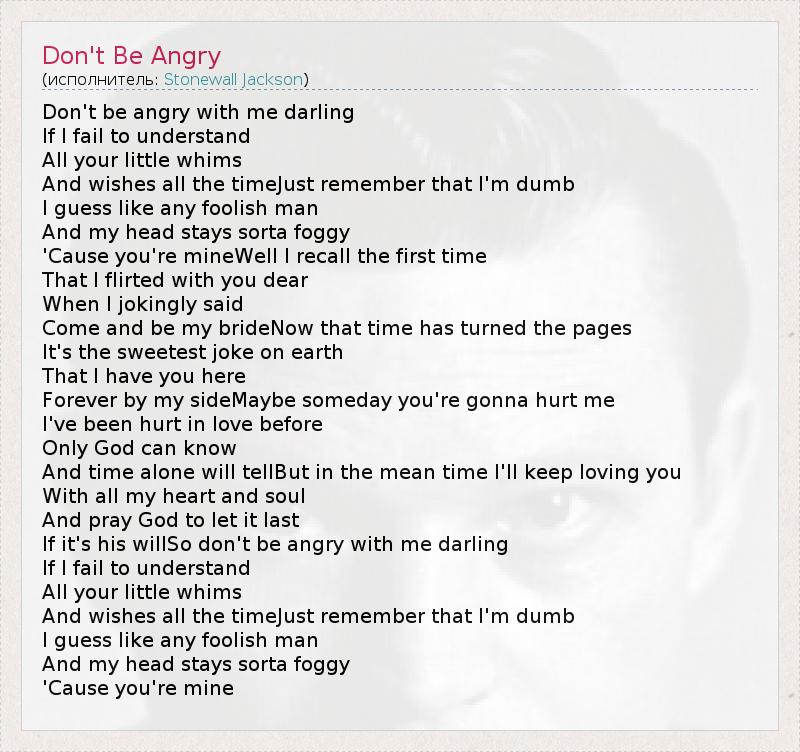 Don't be angry with me darling If I fail to understand All your little whims And wishes all the timeJust remember that I'm dumb I guess like any foolish man And my head stays sorta foggy 'Cause you're mineWell I recall the first time That I flirted with you dear When I jokingly said Come and be my brideNow that time has turned the pages It's the sweetest joke on earth That I have you here Forever by my sideMaybe someday you're gonna hurt me I've been hurt in love before Only God can know And time alone will tellBut in the mean time I'll keep loving you With all my heart and soul And pray God to let it last If it's his willSo don't be angry with me darling If I fail to understand All your little whims And wishes all the timeJust remember that I'm dumb I guess like any foolish man And my head stays sorta foggy 'Cause you're mine