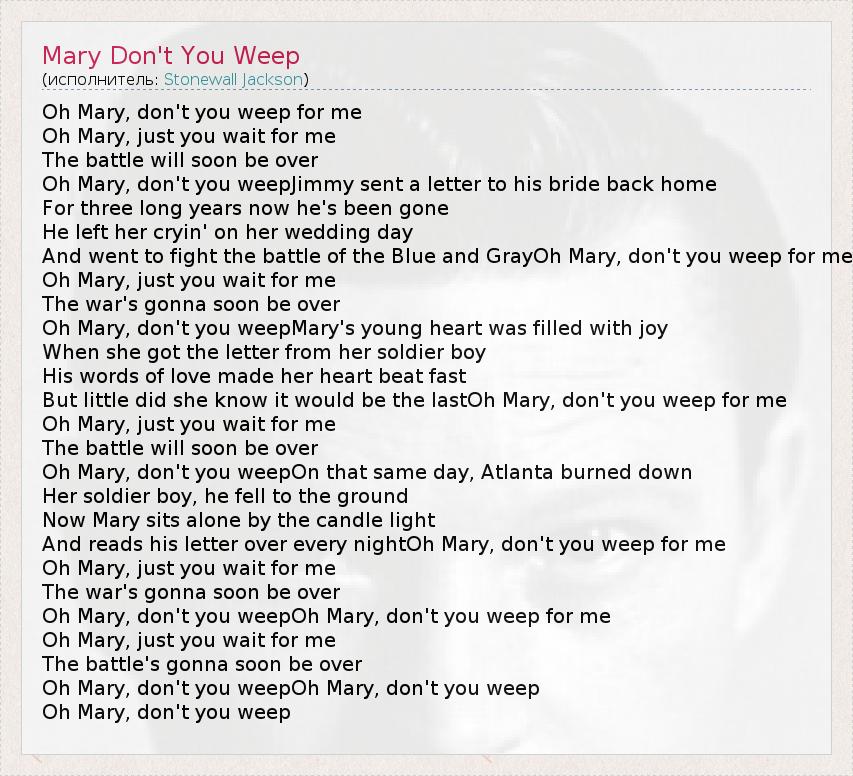 Oh Mary, don't you weep for me Oh Mary, just you wait for me The battle will soon be over Oh Mary, don't you weepJimmy sent a letter to his bride back home For three long years now he's been gone He left her cryin' on her wedding day And went to fight the battle of the Blue and GrayOh Mary, don't you weep for me Oh Mary, just you wait for me The war's gonna soon be over Oh Mary, don't you weepMary's young heart was filled with joy When she got the letter from her soldier boy His words of love made her heart beat fast But little did she know it would be the lastOh Mary, don't you weep for me Oh Mary, just you wait for me The battle will soon be over Oh Mary, don't you weepOn that same day, Atlanta burned down Her soldier boy, he fell to the ground Now Mary sits alone by the candle light And reads his letter over every nightOh Mary, don't you weep for me Oh Mary, just you wait for me The war's gonna soon be over Oh Mary, don't you weepOh Mary, don't you weep for me Oh Mary, just you wait for me The battle's gonna soon be over Oh Mary, don't you weepOh Mary, don't you weep Oh Mary, don't you weep