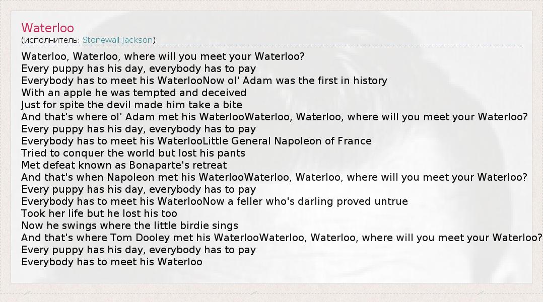 And that's where ol' Adam met his WaterlooWaterloo, Waterloo, where will you meet your Waterloo?