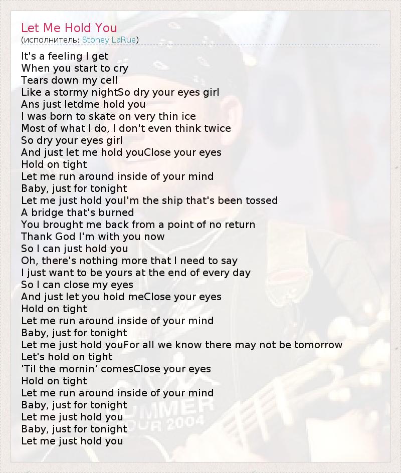 It's a feeling I get When you start to cry Tears down my cell Like a stormy nightSo dry your eyes girl Ans just letdme hold you I was born to skate on very thin ice Most of what I do, I don't even think twice So dry your eyes girl And just let me hold youClose your eyes Hold on tight Let me run around inside of your mind Baby, just for tonight Let me just hold youI'm the ship that's been tossed A bridge that's burned You brought me back from a point of no return Thank God I'm with you now So I can just hold you Oh, there's nothing more that I need to say I just want to be yours at the end of every day So I can close my eyes And just let you hold meClose your eyes Hold on tight Let me run around inside of your mind Baby, just for tonight Let me just hold youFor all we know there may not be tomorrow Let's hold on tight 'Til the mornin' comesClose your eyes Hold on tight Let me run around inside of your mind Baby, just for tonight Let me just hold you Baby, just for tonight Let me just hold you