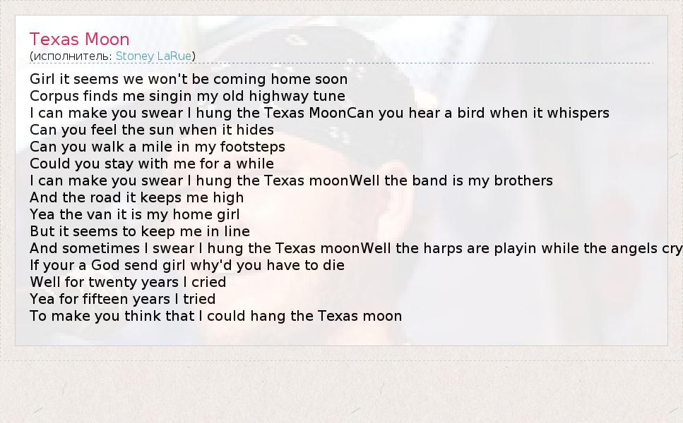 А как ты думаешь, о чем песня "Texas Moon" ?