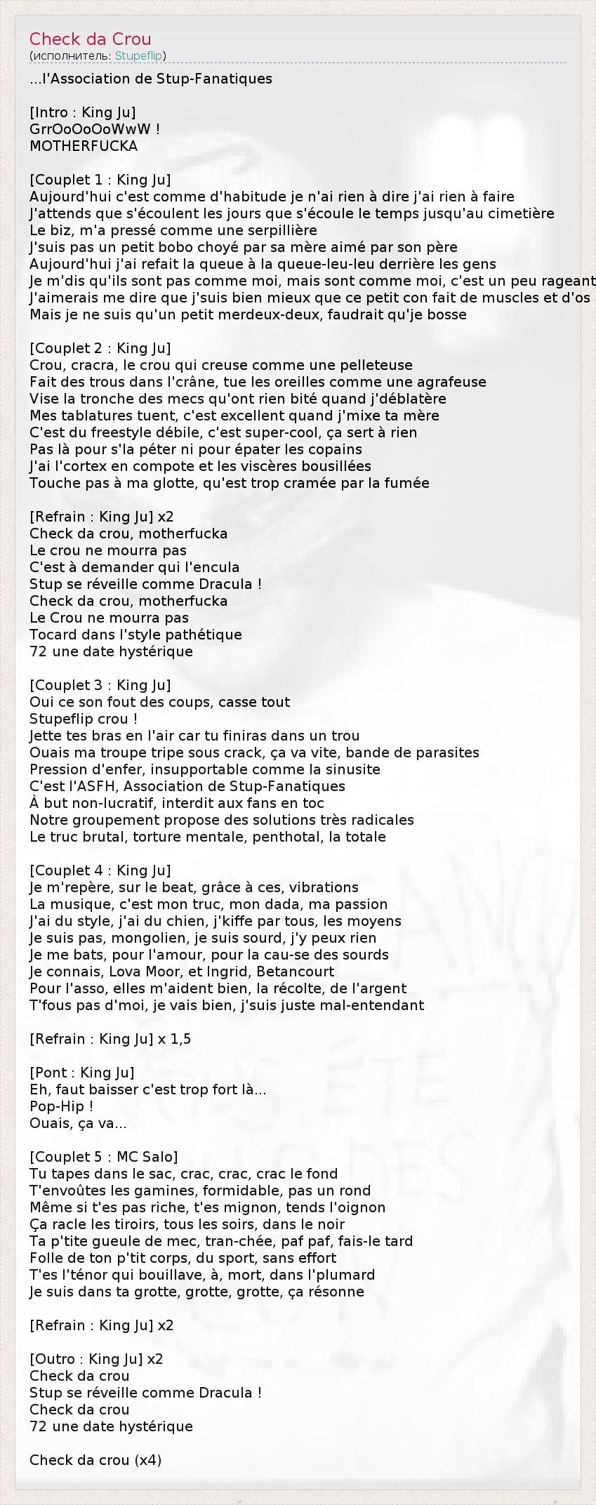 ...l'Association de Stup-Fanatiques [Intro : King Ju] GrrOoOoOoWwW ! MOTHERFUCKA [Couplet 1 : King Ju] Aujourd'hui c'est comme d'habitude je n'ai rien à dire j'ai rien à faire J'attends que s'écoulent les jours que s'écoule le temps jusqu'au cimetière Le biz, m'a pressé comme une serpillière J'suis pas un petit bobo choyé par sa mère aimé par son père Aujourd'hui j'ai refait la queue à la queue-leu-leu derrière les gens Je m'dis qu'ils sont pas comme moi, mais sont comme moi, c'est un peu rageant J'aimerais me dire que j'suis bien mieux que ce petit con fait de muscles et d'os Mais je ne suis qu'un petit merdeux-deux, faudrait qu'je bosse [Couplet 2 : King Ju] Crou, cracra, le crou qui creuse comme une pelleteuse Fait des trous dans l'crâne, tue les oreilles comme une agrafeuse Vise la tronche des mecs qu'ont rien bité quand j'déblatère Mes tablatures tuent, c'est excellent quand j'mixe ta mère C'est du freestyle débile, c'est super-cool, ça sert à rien Pas là pour s'la péter ni pour épater les copains J'ai l'cortex en compote et les viscères bousillées Touche pas à ma glotte, qu'est trop cramée par la fumée [Refrain : King Ju] x2 Check da crou, motherfucka Le crou ne mourra pas C'est à demander qui l'encula Stup se réveille comme Dracula ! Check da crou, motherfucka Le Crou ne mourra pas Tocard dans l'style pathétique 72 une date hystérique [Couplet 3 : King Ju] Oui ce son fout des coups, casse tout Stupeflip crou ! Jette tes bras en l'air car tu finiras dans un trou Ouais ma troupe tripe sous crack, ça va vite, bande de parasites Pression d'enfer, insupportable comme la sinusite C'est l'ASFH, Association de Stup-Fanatiques À but non-lucratif, interdit aux fans en toc Notre groupement propose des solutions très radicales Le truc brutal, torture mentale, penthotal, la totale [Couplet 4 : King Ju] Je m'repère, sur le beat, grâce à ces, vibrations La musique, c'est mon truc, mon dada, ma passion J'ai du style, j'ai du chien, j'kiffe par tous, les moyens Je suis pas, mongolien, je suis sourd, j'y peux rien Je me bats, pour l'amour, pour la cau-se des sourds Je connais, Lova Moor, et Ingrid, Betancourt Pour l'asso, elles m'aident bien, la récolte, de l'argent T'fous pas d'moi, je vais bien, j'suis juste mal-entendant [Refrain : King Ju] x 1,5 [Pont : King Ju] Eh, faut baisser c'est trop fort là... Pop-Hip ! Ouais, ça va... [Couplet 5 : MC Salo] Tu tapes dans le sac, crac, crac, crac le fond T'envoûtes les gamines, formidable, pas un rond Même si t'es pas riche, t'es mignon, tends l'oignon Ça racle les tiroirs, tous les soirs, dans le noir Ta p'tite gueule de mec, tran-chée, paf paf, fais-le tard Folle de ton p'tit corps, du sport, sans effort T'es l'ténor qui bouillave, à, mort, dans l'plumard Je suis dans ta grotte, grotte, grotte, ça résonne [Refrain : King Ju] x2 [Outro : King Ju] x2 Check da crou Stup se réveille comme Dracula ! Check da crou 72 une date hystérique Check da crou (x4)