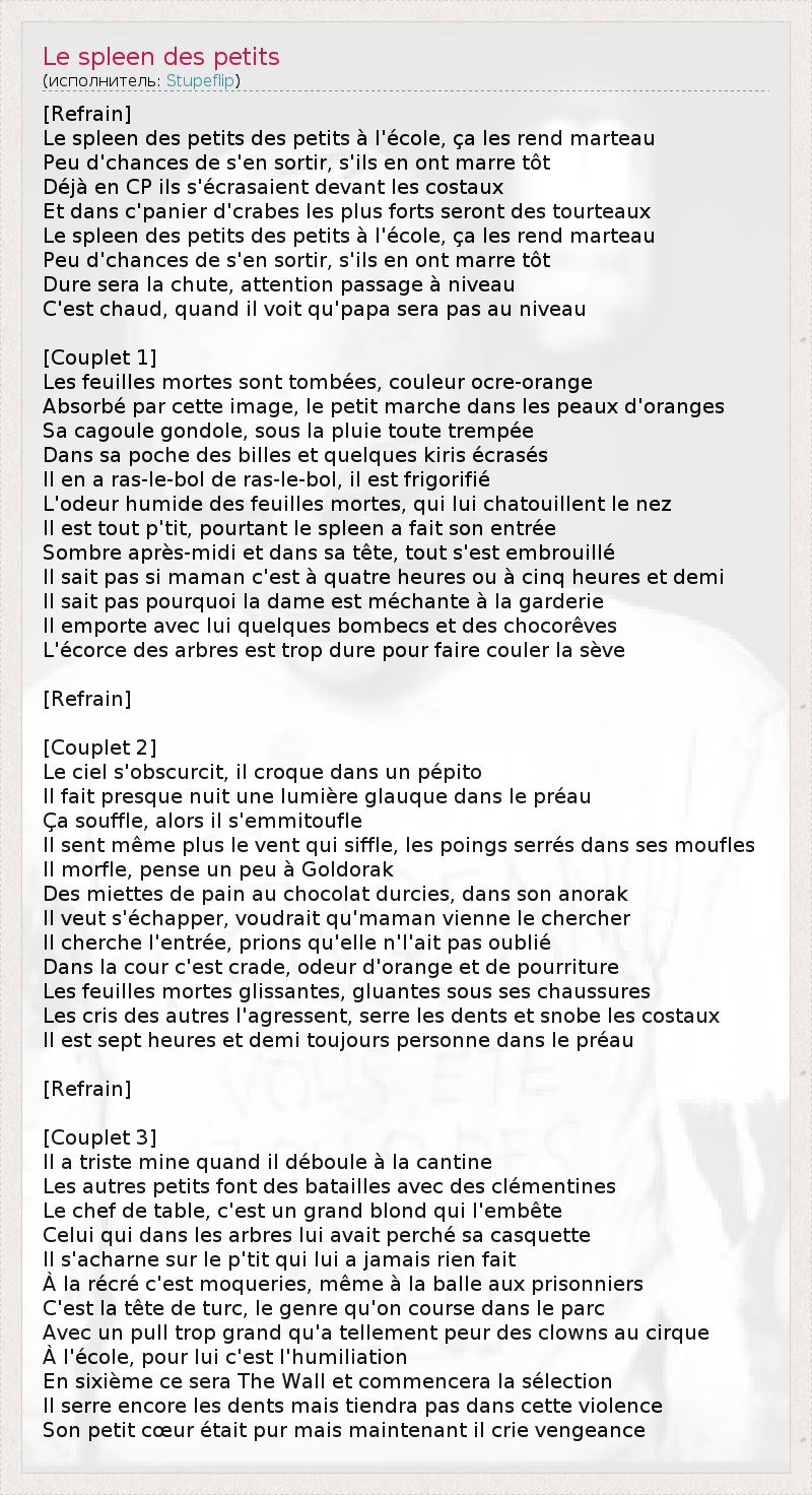 [Refrain] Le spleen des petits des petits à l'école, ça les rend marteau Peu d'chances de s'en sortir, s'ils en ont marre tôt Déjà en CP ils s'écrasaient devant les costaux Et dans c'panier d'crabes les plus forts seront des tourteaux Le spleen des petits des petits à l'école, ça les rend marteau Peu d'chances de s'en sortir, s'ils en ont marre tôt Dure sera la chute, attention passage à niveau C'est chaud, quand il voit qu'papa sera pas au niveau [Couplet 1] Les feuilles mortes sont tombées, couleur ocre-orange Absorbé par cette image, le petit marche dans les peaux d'oranges Sa cagoule gondole, sous la pluie toute trempée Dans sa poche des billes et quelques kiris écrasés Il en a ras-le-bol de ras-le-bol, il est frigorifié L'odeur humide des feuilles mortes, qui lui chatouillent le nez Il est tout p'tit, pourtant le spleen a fait son entrée Sombre après-midi et dans sa tête, tout s'est embrouillé Il sait pas si maman c'est à quatre heures ou à cinq heures et demi Il sait pas pourquoi la dame est méchante à la garderie Il emporte avec lui quelques bombecs et des chocorêves L'écorce des arbres est trop dure pour faire couler la sève [Refrain] [Couplet 2] Le ciel s'obscurcit, il croque dans un pépito Il fait presque nuit une lumière glauque dans le préau Ça souffle, alors il s'emmitoufle Il sent même plus le vent qui siffle, les poings serrés dans ses moufles Il morfle, pense un peu à Goldorak Des miettes de pain au chocolat durcies, dans son anorak Il veut s'échapper, voudrait qu'maman vienne le chercher Il cherche l'entrée, prions qu'elle n'l'ait pas oublié Dans la cour c'est crade, odeur d'orange et de pourriture Les feuilles mortes glissantes, gluantes sous ses chaussures Les cris des autres l'agressent, serre les dents et snobe les costaux Il est sept heures et demi toujours personne dans le préau [Refrain] [Couplet 3] Il a triste mine quand il déboule à la cantine Les autres petits font des batailles avec des clémentines Le chef de table, c'est un grand blond qui l'embête Celui qui dans les arbres lui avait perché sa casquette Il s'acharne sur le p'tit qui lui a jamais rien fait À la récré c'est moqueries, même à la balle aux prisonniers C'est la tête de turc, le genre qu'on course dans le parc Avec un pull trop grand qu'a tellement peur des clowns au cirque À l'école, pour lui c'est l'humiliation En sixième ce sera The Wall et commencera la sélection Il serre encore les dents mais tiendra pas dans cette violence Son petit cœur était pur mais maintenant il crie vengeance