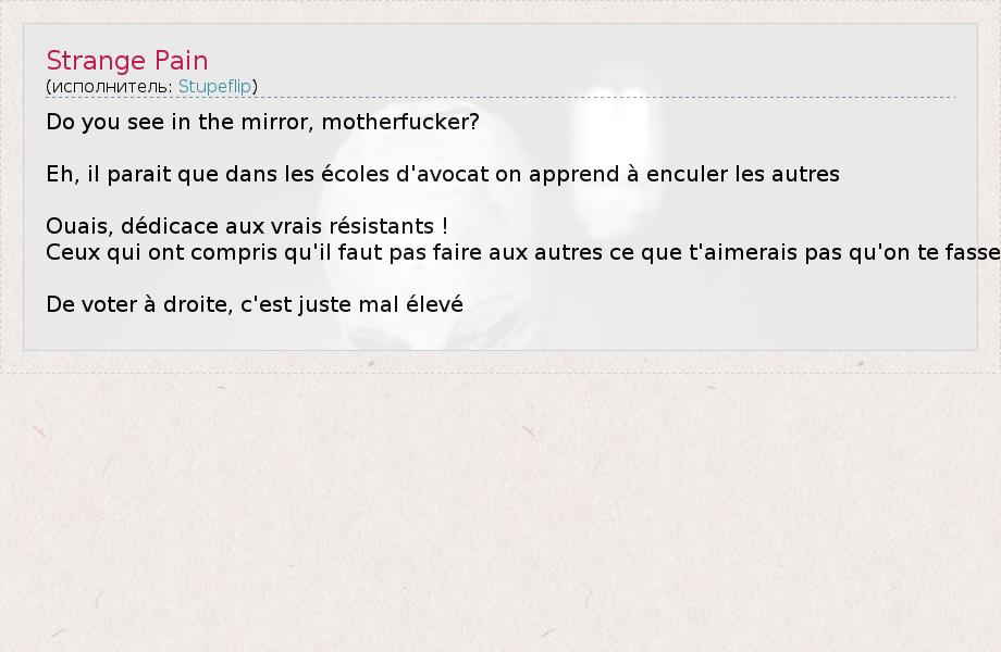 Do you see in the mirror, motherfucker? Eh, il parait que dans les écoles d'avocat on apprend à enculer les autres Ouais, dédicace aux vrais résistants ! Ceux qui ont compris qu'il faut pas faire aux autres ce que t'aimerais pas qu'on te fasse De voter à droite, c'est juste mal élevé